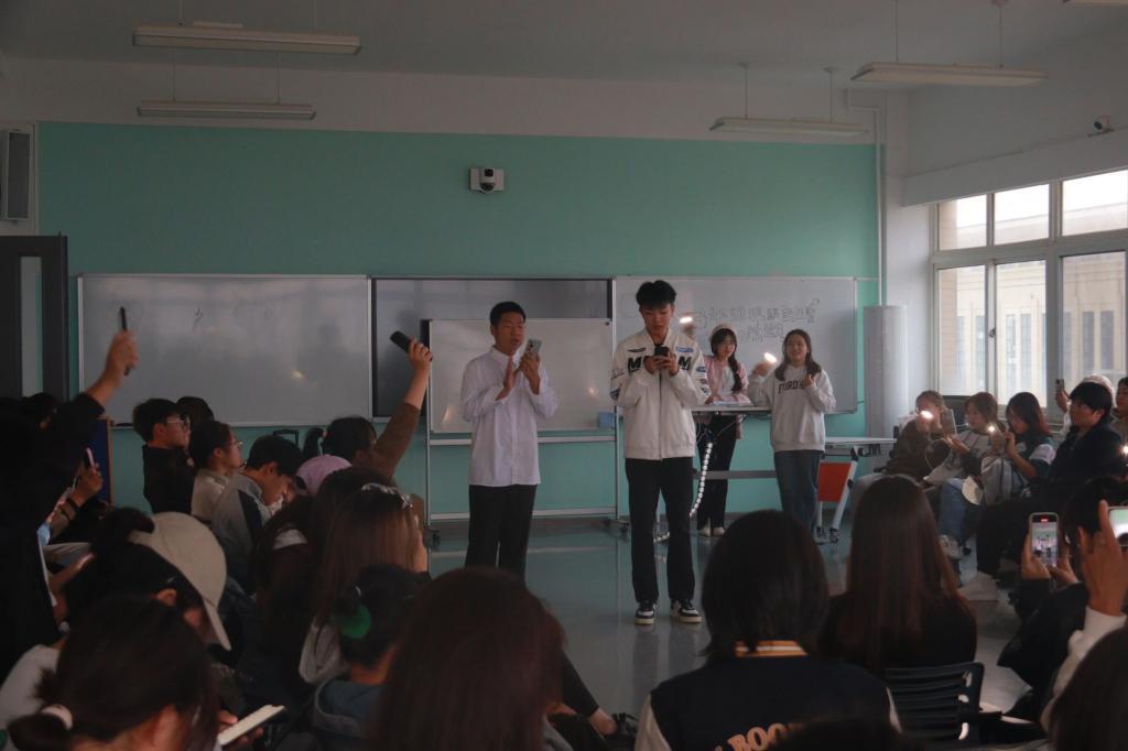暖場(chǎng)游戲結(jié)束后,主持人安排 12 位年級(jí)組織成員上前進(jìn)行自我介紹,其余人傳遞紙箱抽取卡片,并加上微信,如果兩?抽到互相寫的卡片,可任意指定一人接受懲罰。隨后被指定的人紛紛上臺(tái)大展歌喉,此刻夜幕降臨,同學(xué)們手機(jī)的手電筒化作應(yīng)援棒,帶來點(diǎn)點(diǎn)星光。