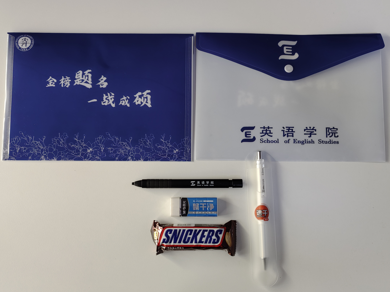 會(huì)議伊始,輔導(dǎo)員王藝凝老師向同學(xué)們介紹了學(xué)院精心準(zhǔn)備的“考研加油包”:一支黑色中性筆、一支定制涂卡筆、一塊橡皮,既方便實(shí)用的同時(shí)又希望大家答題順利,筆下生花;一塊士力架巧克力,愿為同學(xué)們補(bǔ)充能量,助力學(xué)子們揚(yáng)帆起航;還有一個(gè)印有學(xué)校和學(xué)院logo以及校花玉蘭花的文件袋,向大家生動(dòng)地展示著“金榜題名,一戰(zhàn)成碩”的美好祝福!動(dòng)員會(huì)現(xiàn)場的加油包擺成了“E·2024”的字樣,其中每一份加油包都傳遞著老師們對2024屆畢業(yè)生順利考研上岸的真摯祝愿和期許。