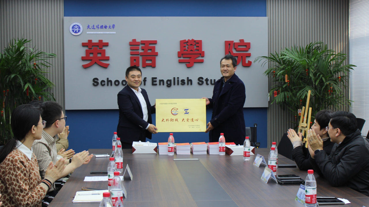 隨后,為感謝英語學(xué)院長期以來為大連市殘疾青年協(xié)會提供的英語專業(yè)服務(wù)與學(xué)習(xí)指導(dǎo),以及多年以來對殘疾青年志愿服務(wù)的大力支持,戰(zhàn)雪峰主席向我院授予“大外助殘 大愛連心”牌匾,孫碩書記作為代表接收牌匾。最后,與會雙方人員攜大連市殘青協(xié)會會旗與大連外國語大學(xué)英語學(xué)院院旗,在勵業(yè)樓門前合影留念。