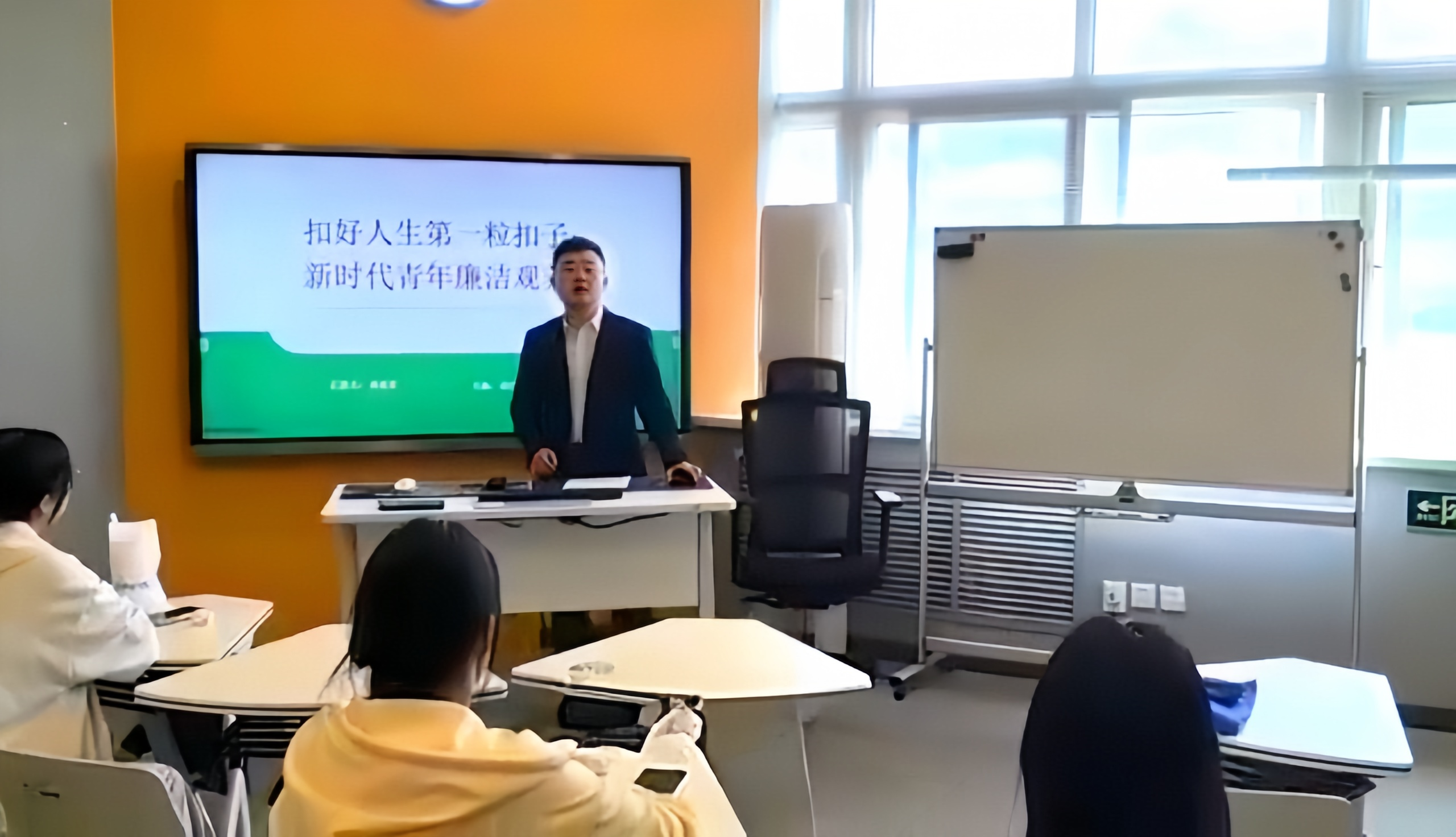 5月22日,英語(yǔ)學(xué)院團(tuán)委書記曲鏡達(dá)于VR實(shí)訓(xùn)中心為入團(tuán)積極分子帶來(lái)團(tuán)課第二講課程。本次課程主題為“扣好人生第一粒扣子:新時(shí)代青年廉潔觀養(yǎng)成”。本次課程聚焦廉潔觀的內(nèi)涵與養(yǎng)成路徑,從“廉潔觀的時(shí)代價(jià)值”“青年面臨的廉潔風(fēng)險(xiǎn)”及“實(shí)踐養(yǎng)成方法”三大維度展開(kāi)講解。曲鏡達(dá)老師結(jié)合青年群體特點(diǎn),剖析了廉潔觀對(duì)個(gè)人品德塑造、社會(huì)風(fēng)氣引領(lǐng)及國(guó)家長(zhǎng)遠(yuǎn)發(fā)展的深層意義,引導(dǎo)學(xué)生在虛擬實(shí)踐中強(qiáng)化責(zé)任擔(dān)當(dāng)與誠(chéng)信意識(shí)。最后,曲鏡達(dá)老師希望新時(shí)代青年應(yīng)以“公正無(wú)私”“勤儉節(jié)約”等傳統(tǒng)美德為錨點(diǎn),主動(dòng)抵制消費(fèi)攀比、學(xué)術(shù)不端等現(xiàn)實(shí)挑戰(zhàn),將廉潔自律融入學(xué)習(xí)生活與未來(lái)職業(yè)選擇。