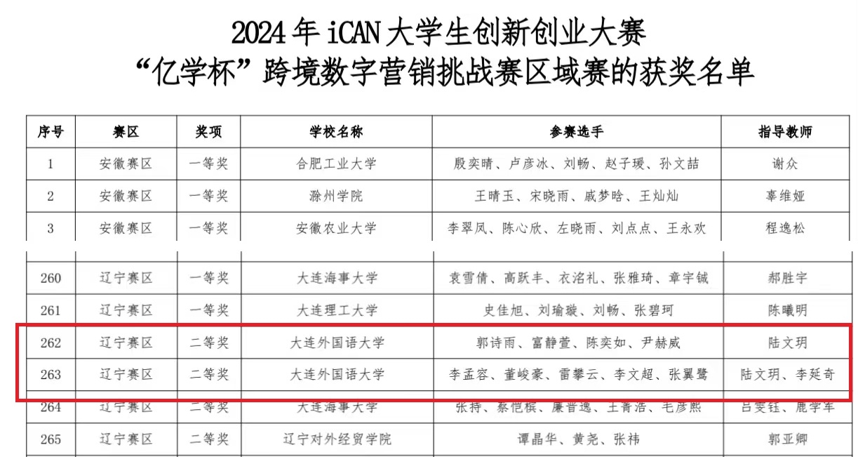 10月15日,2024 年iCAN 大學生創(chuàng)新創(chuàng)業(yè)大賽“億學杯”跨境數(shù)字營銷挑戰(zhàn)賽區(qū)域賽階段圓滿落幕。在英語學院陸文玥、李延奇老師的指導下,由商務英語專業(yè)李孟容、郭詩雨帶領的兩支參賽隊伍積極報名,認真?zhèn)滟悾罱K均獲得遼寧賽區(qū)二等獎。