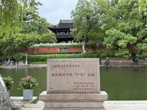 實(shí)踐團(tuán)乘船抵達(dá)南湖湖心島。這座僅1公頃的小島,既是地理上的“革命原點(diǎn)”,更是精神上的“信仰燈塔”。南湖紅船,長(zhǎng)16米、寬3米,紫光漆船身與艙內(nèi)八仙桌、藤椅、銅制燈具等細(xì)節(jié),均依當(dāng)事人回憶復(fù)原——正是在這里,代表們通過(guò)《中國(guó)共產(chǎn)黨第一個(gè)綱領(lǐng)》,以“第三國(guó)際萬(wàn)歲”的呼聲宣告中國(guó)共產(chǎn)黨正式成立。煙雨樓前董必武題寫(xiě)的楹聯(lián)“煙雨樓臺(tái)革命萌生此間曾著星星火,風(fēng)云世界逢春蟄起到處皆聞殷殷雷”,將千年園林與百年黨史巧妙勾連;樓前兩棵450年樹(shù)齡的銀杏樹(shù),既見(jiàn)證過(guò)明清文人雅集,更目睹了一大代表們的歷史時(shí)刻。
