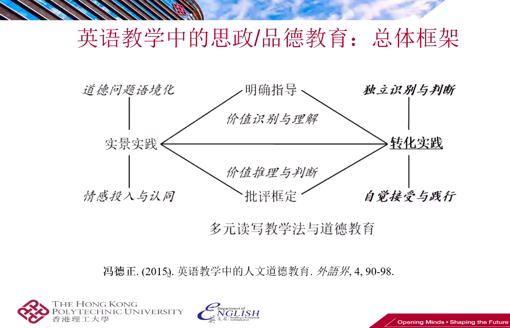 馮德正教授首先提出研究的第一步應從現(xiàn)象出發(fā),以問題驅動為研究策略,并隨后就如何在英語課堂教學中有效實施思政教育,以及如何將思政內容融入教學過程展開探討。馮教授認為教師應明確深入理解教材與其他教學素材是如何通過角色設計、故事情節(jié)等復雜多模態(tài)資源設計思政元素,并在課堂上對學生進行科學引導,培養(yǎng)學生的思維與分析能力,使其自覺接受并踐行正面價值觀。馮教授還闡釋了多層次教學目標、多模態(tài)教學資源和多元讀寫教學方法,并指出思政價值是具體的、動態(tài)的和建構的,思政教育不能只是讓學生想,而是要通過明確指導教給學生思考和分析的方法,根據(jù)系統(tǒng)的理論框架設計問題,提高學生分析問題和解決問題的能力。