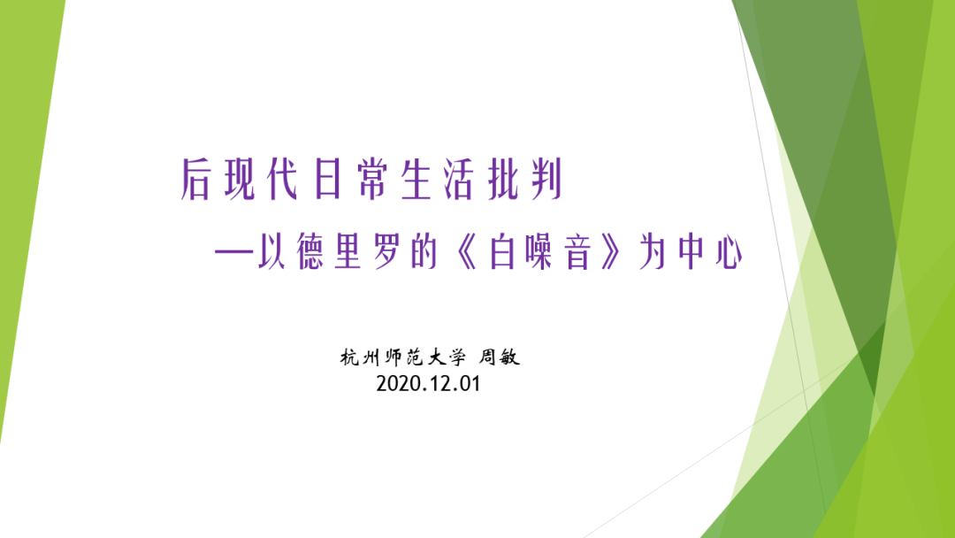 12月1日,杭州師范大學(xué)周敏教授應(yīng)我校科研處與英語學(xué)院邀請(qǐng),通過騰訊會(huì)議平臺(tái)為我院師生做了題為“后現(xiàn)代日常生活批判”的學(xué)術(shù)講座。本次講座是我院英語文學(xué)系列講座之一,由李文萍教授主持,我院教師及碩士研究生共同聆聽了此次講座。