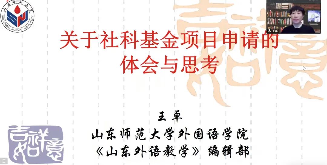 10月13日,山東師范大學(xué)外國語學(xué)院院長王卓教授應(yīng)我校科研處和英語學(xué)院的邀請(qǐng),通過騰訊會(huì)議平臺(tái)為我院師生做了題為“關(guān)于社科基金項(xiàng)目申請(qǐng)的體會(huì)與思考”的學(xué)術(shù)講座。本次講座為我院“外語學(xué)科融合發(fā)展”高端云講壇系列講座之一,由李文萍教授主持,我院部分教師、碩士研究生及英語語言文學(xué)方向的本科生共同聆聽了此次講座。