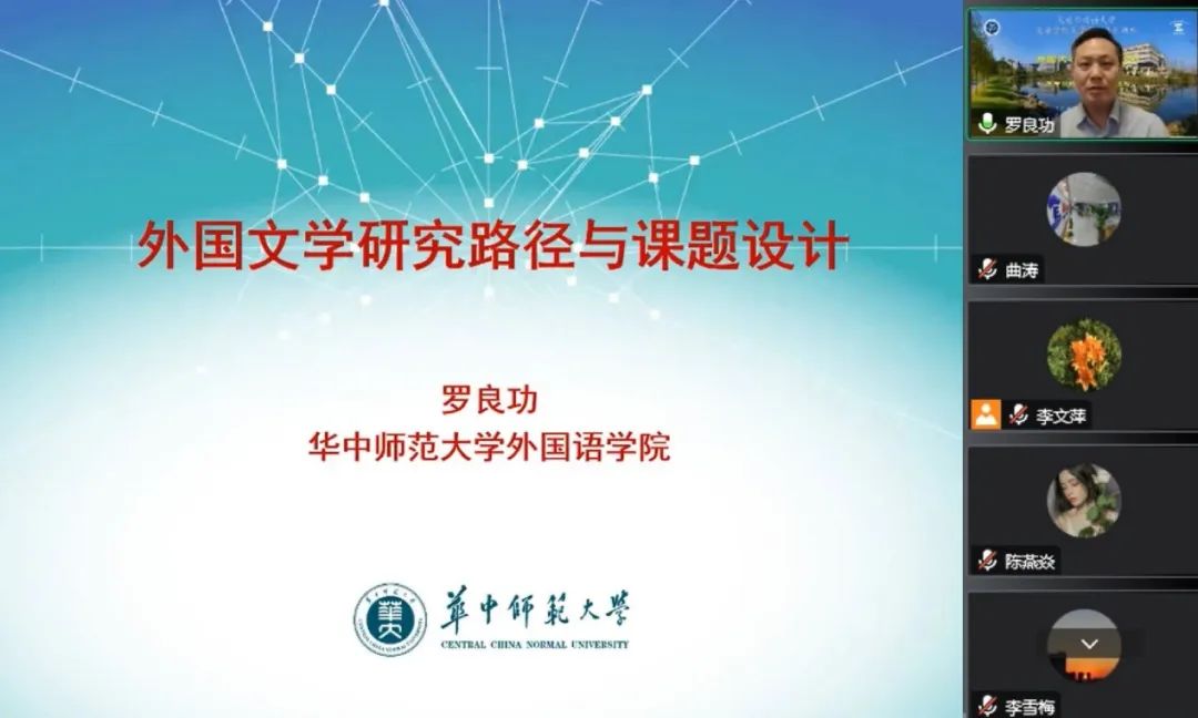 10月18日,華中師范大學(xué)外國(guó)語(yǔ)學(xué)院院長(zhǎng)羅良功教授應(yīng)我校科研處和英語(yǔ)學(xué)院邀請(qǐng),通過(guò)騰訊會(huì)議平臺(tái)為我院師生做了題為“外國(guó)文學(xué)研究路徑與課題設(shè)計(jì)”的學(xué)術(shù)講座。本次講座為我院“外語(yǔ)學(xué)科融合發(fā)展”高端云講壇系列講座之一,由李文萍教授主持,我院部分教師、碩士研究生及英語(yǔ)語(yǔ)言文學(xué)方向本科生共同聆聽了此次講座。