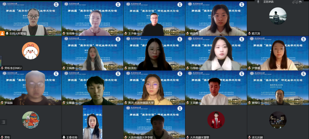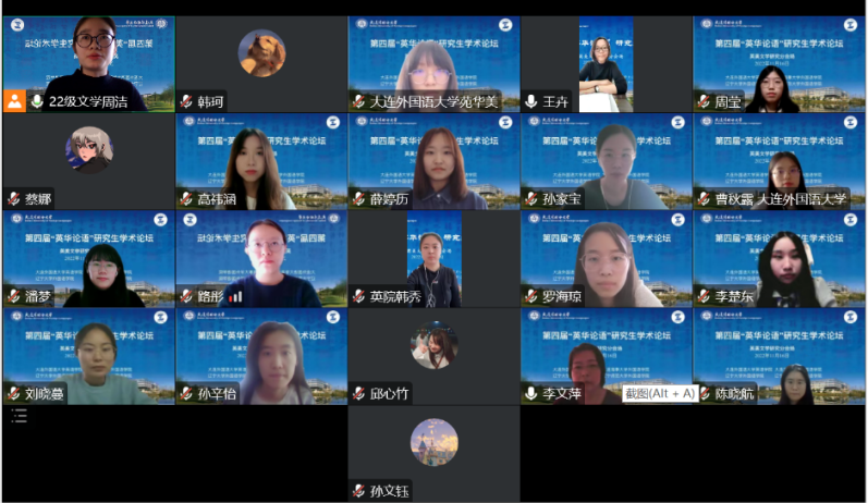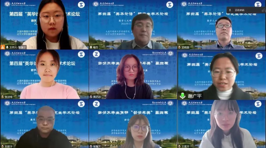 11月16日下午,第四屆“英華論語”研究生學術創(chuàng)新論壇在大連外國語大學成功舉辦。本次論壇由大連外國語大學英語學院、大連海事大學外國語學院、遼寧大學外國語學院、遼寧師范大學外國語學院聯(lián)合舉辦,旨在為研究生搭建高質量學術交流平臺,緊跟國家戰(zhàn)略,響應時代需求,突出思想性、科學性、交叉性與創(chuàng)新性,著力培養(yǎng)高層次創(chuàng)新型青年人才,為建設社會主義現(xiàn)代化強國提供有力的人才支撐。本次論壇采用線上模式進行,下設理論語言學研究、翻譯研究、政治文本翻譯研究、英美文學研究、數(shù)字人文研究、外語教學研究六個分論壇。