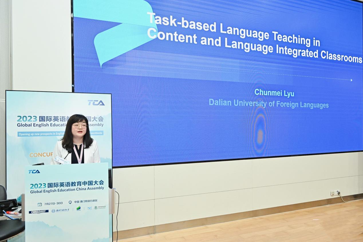 7月28日下午,常俊躍教授主持了2023國際英語教育中國大會“內容語言融合課程體系的建構與實踐”專題研討,并以“從語言導向培訓到內容語言融合教育——外語教育理念的變革”為主題進行了發(fā)言。常教授以大連外國語大學英語專業(yè)為例,介紹了內容語言融合教育理念(CLI)的內涵及其實踐效果。夏洋教授以“內容語言融合課程教師教學能力發(fā)展研究”為主題進行了專題發(fā)言,基于對內容語言融合課程教師開展的實證研究,分享了中國外語教育環(huán)境下內容語言融合課程教師教學能力的構成及教學能力發(fā)展路徑。呂春媚教授進行了題為“內容語言融合課程的任務型教學”的專題發(fā)言,以國家級一流本科課程《跨文化交際》為例,介紹了內容語言融合教學理念與任務型語言教學相結合的教學模式。