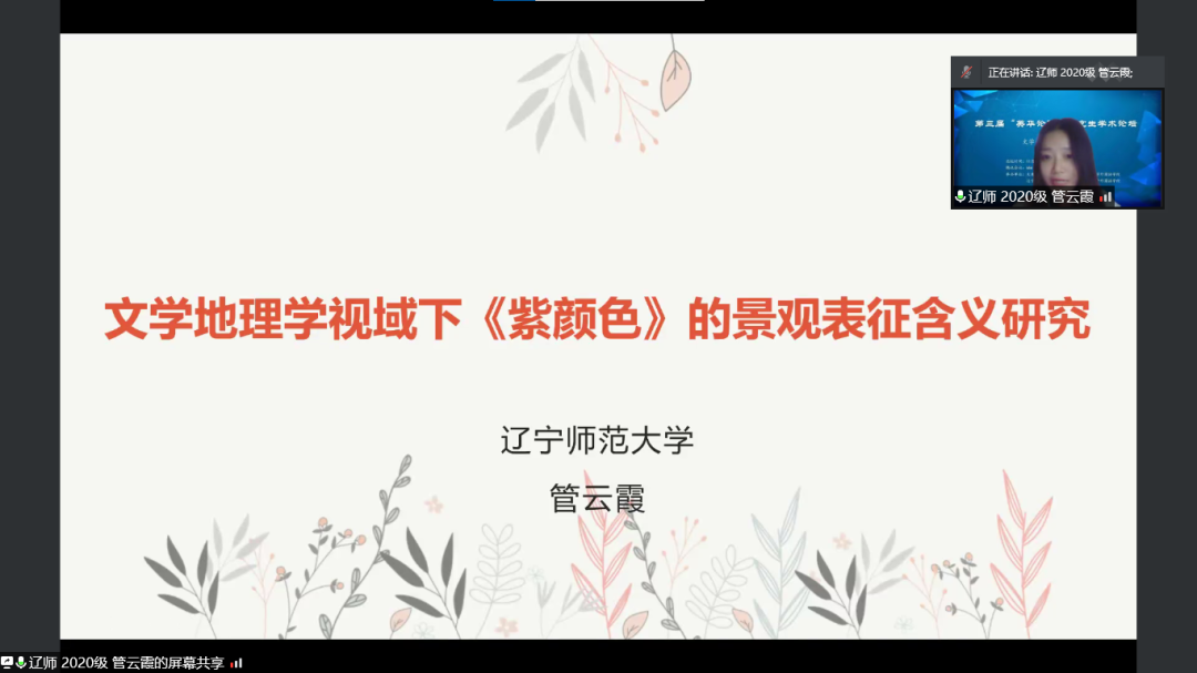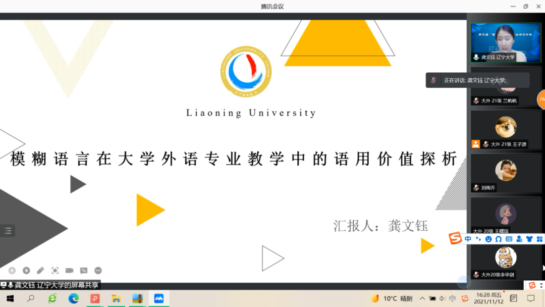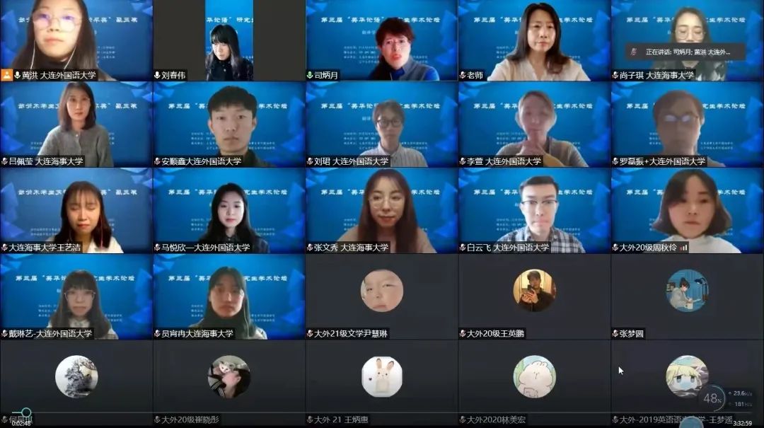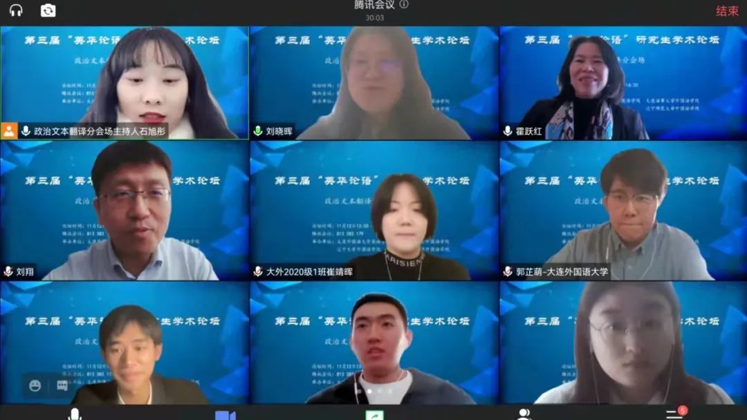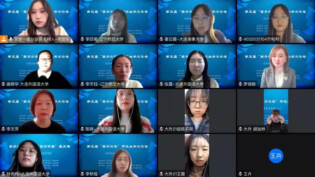 11月12日下午,大連外國(guó)語(yǔ)大學(xué)英語(yǔ)學(xué)院、大連海事大學(xué)外國(guó)語(yǔ)學(xué)院、遼寧大學(xué)外國(guó)語(yǔ)學(xué)院、遼寧師范大學(xué)外國(guó)語(yǔ)學(xué)院聯(lián)合舉辦的第三屆“英華論語(yǔ)”研究生學(xué)術(shù)論壇圓滿(mǎn)結(jié)束。本次論壇旨在貫徹落實(shí)習(xí)近平總書(shū)記關(guān)于研究生教育工作的重要指示精神,提升研究生創(chuàng)新學(xué)術(shù)素養(yǎng),增進(jìn)校際間研究生學(xué)術(shù)交流與合作,力圖為國(guó)家培養(yǎng)和儲(chǔ)備高層次創(chuàng)新型人才。本次論壇采用線(xiàn)上模式進(jìn)行,共設(shè)理論語(yǔ)言學(xué)、翻譯學(xué)、政治文本翻譯、文學(xué)(一)、文學(xué)(二)、外語(yǔ)教學(xué)六個(gè)分會(huì)場(chǎng),吸引了來(lái)自四所院校100多名研究生的積極參與。經(jīng)過(guò)專(zhuān)家評(píng)審,共有65名研究生進(jìn)行了線(xiàn)上發(fā)言。
