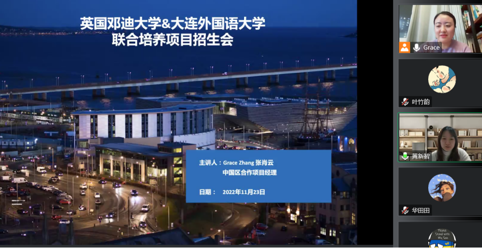 為了使同學進一步了解合作院校國際交流項目,合理安排學業(yè)規(guī)劃,英語學院于11月23日邀請英國鄧迪大學中國區(qū)項目負責人張肖云女士進行了留學項目線上宣講會。本次宣講會由學院留學工作外事秘書黃新智老師主持,對留學項目感興趣的本科生和研究生參加了此次宣講會。