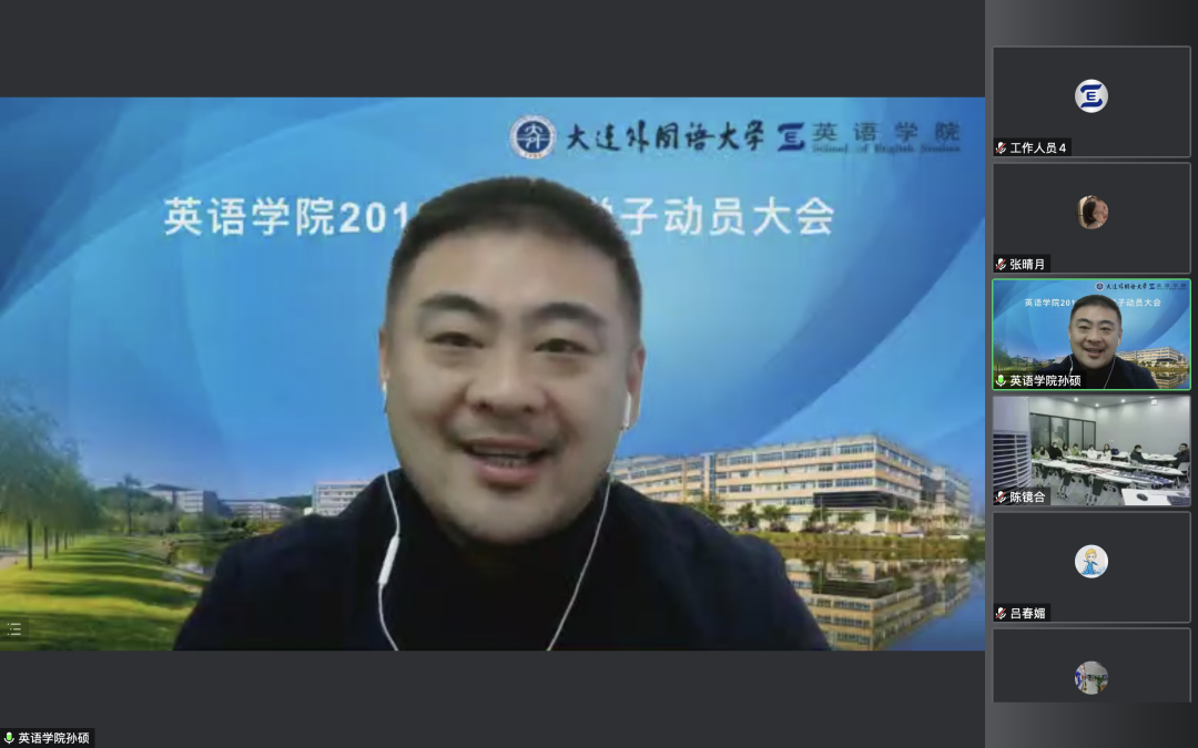 12月9日下午,為鼓勵(lì)即將邁入考場的2019級考研學(xué)子,英語學(xué)院以線上線下相結(jié)合的方式舉行了考研學(xué)子考前動員會。本次動員會由黨委副書記兼紀(jì)委書記孫碩主持,院長呂春媚、英語學(xué)院黨委梁若冰副書記、副院長曲濤、副院長劉曉暉、副院長王成東、英語學(xué)院團(tuán)委書記兼2019級輔導(dǎo)員曲鏡達(dá)、2019級輔導(dǎo)員吳曼、2021級輔導(dǎo)員達(dá)尼亞爾江·亞力坤江以及研究生輔導(dǎo)員黃新智參與此次動員會。