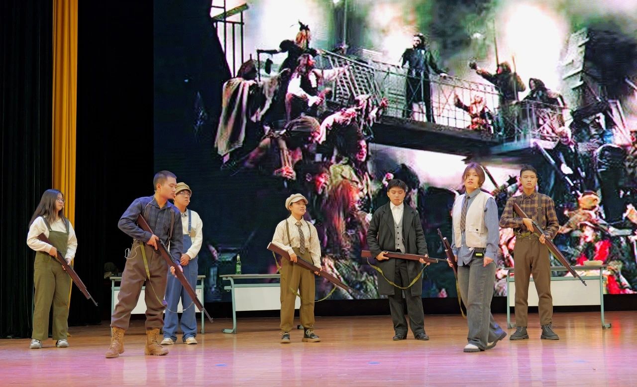 2023級劇組帶來的《悲慘世界》拉開了本次展演的帷幕。本劇目主要講述了以ABC社團(tuán)為代表的革命成員在法國大革命前夕與間諜沙威和敵軍發(fā)生激烈沖突的故事,展現(xiàn)出了大革命前后那個政權(quán)更迭、社會動蕩、民不聊生的悲慘世界景象。在表演的過程中,演員們?nèi)橥度耄曊{(diào)高亢激昂,讓觀眾們身臨其境地感受那個充斥著尖銳階級矛盾的法國社會。