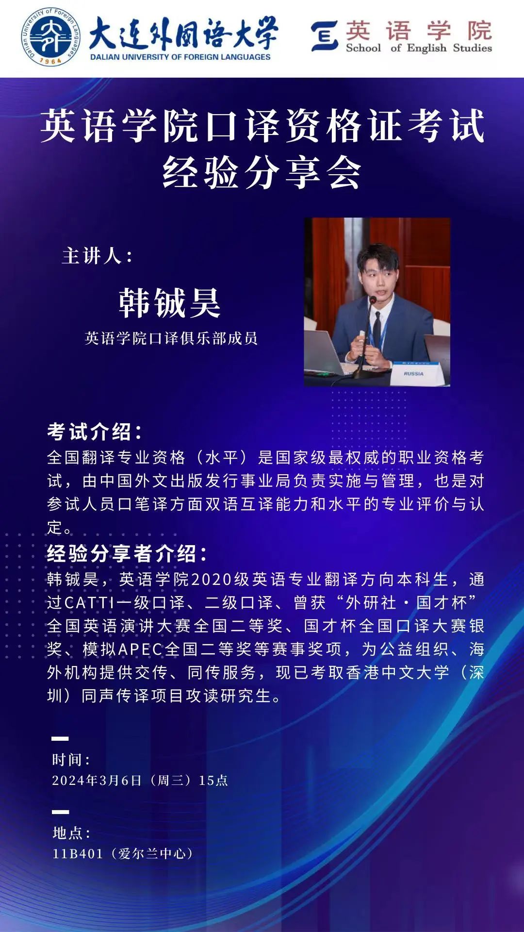 為了提高同學(xué)們的翻譯水平,增加大家對CATTI備考相關(guān)內(nèi)容的了解,英語學(xué)院口譯俱樂部成員韓鋮昊同學(xué)將于2024年3月6日(周三)15點(diǎn)在11B401(愛爾蘭中心)與大家共分享其在口譯學(xué)習(xí)和CATTI備考過程中的心得和經(jīng)驗(yàn)。