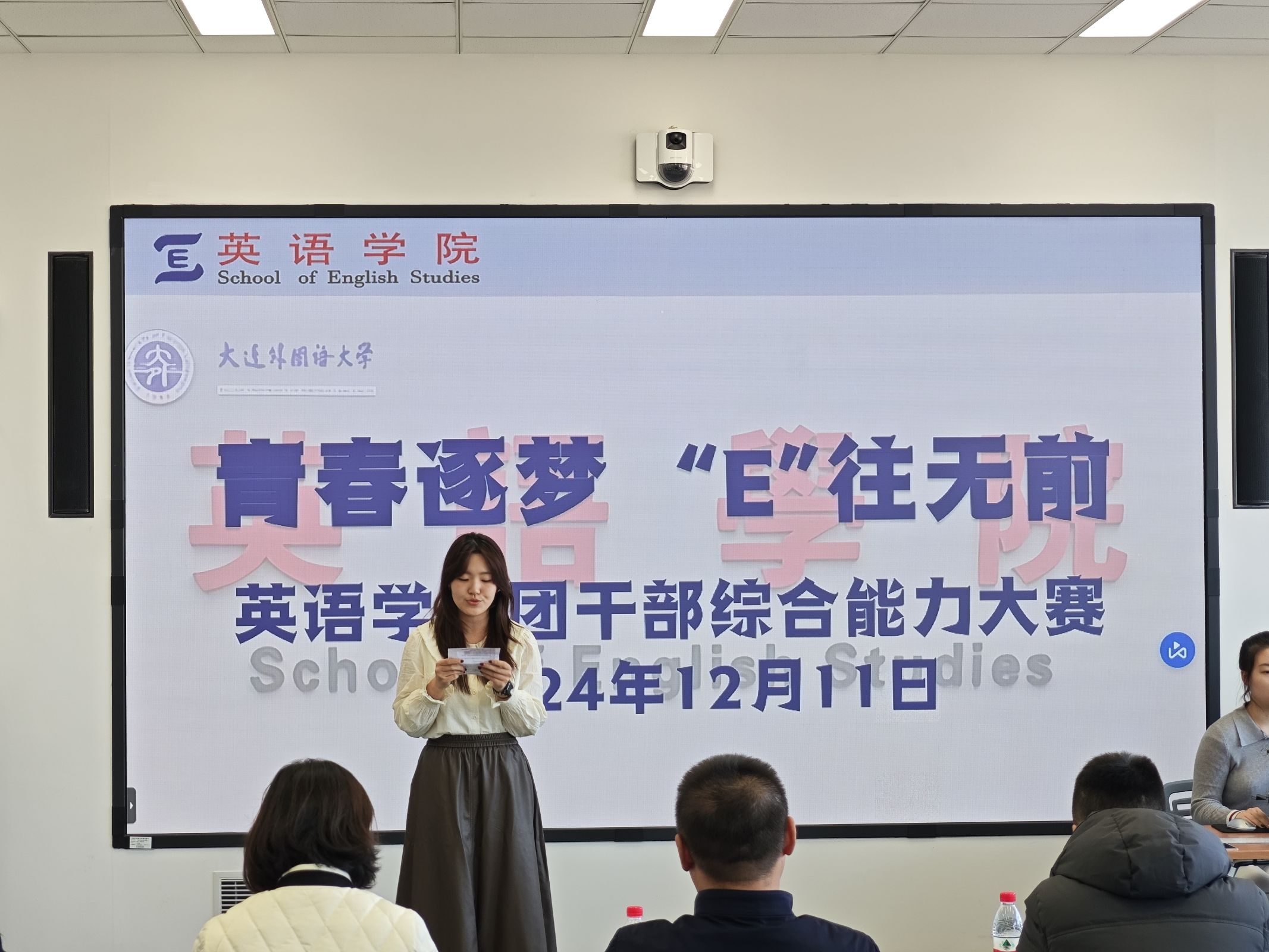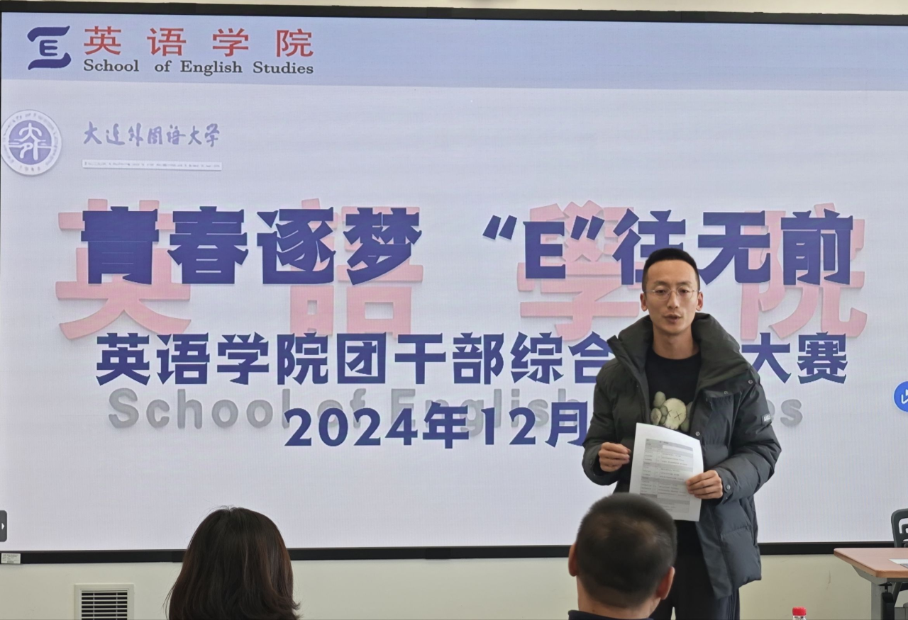 12月11日,英語學院團干部綜合能力大賽決賽于勵業(yè)樓402室成功舉辦。大連外國語大學英語學院黨委副書記兼紀委書記孫碩、大連交通大學機械工程學院團委書記王衍、大連外國語大學德語學院團委書記溫麗娜、大連外國語大學校團委干事翟芮及大連外國語大學英語學院團委書記曲鏡達擔任此次比賽評委。