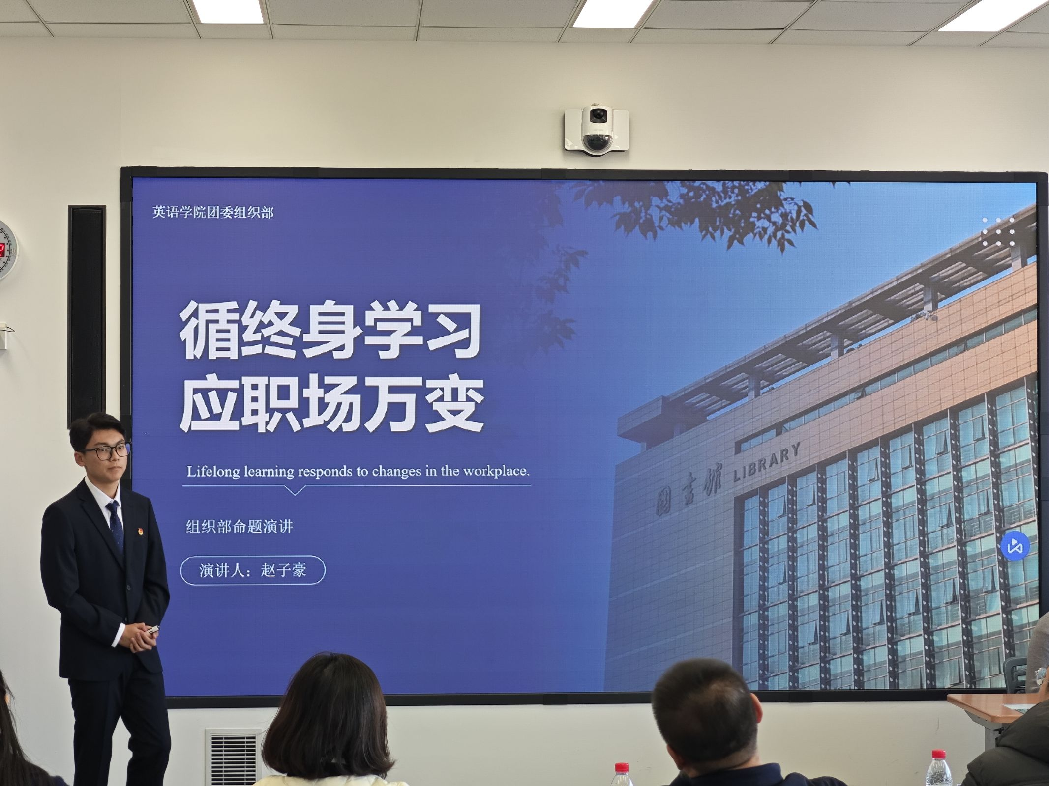 大賽接近尾聲,大連交通大學機械工程學院團委書記王衍對此次比賽進行了簡單回顧與總結,并提出兩校學生干部相互學習、相互進步的美好愿景。在公布各組分數(shù)后,英語學院黨委副書記兼紀委書記孫碩向遠道而來的評委老師們表示衷心感謝,并對參與本次比賽的選手們給予了高度評價與認可,他期望英院學子們能夠不斷完善自我,充分利用好當下的資源,繼續(xù)為英語學院作出貢獻。
