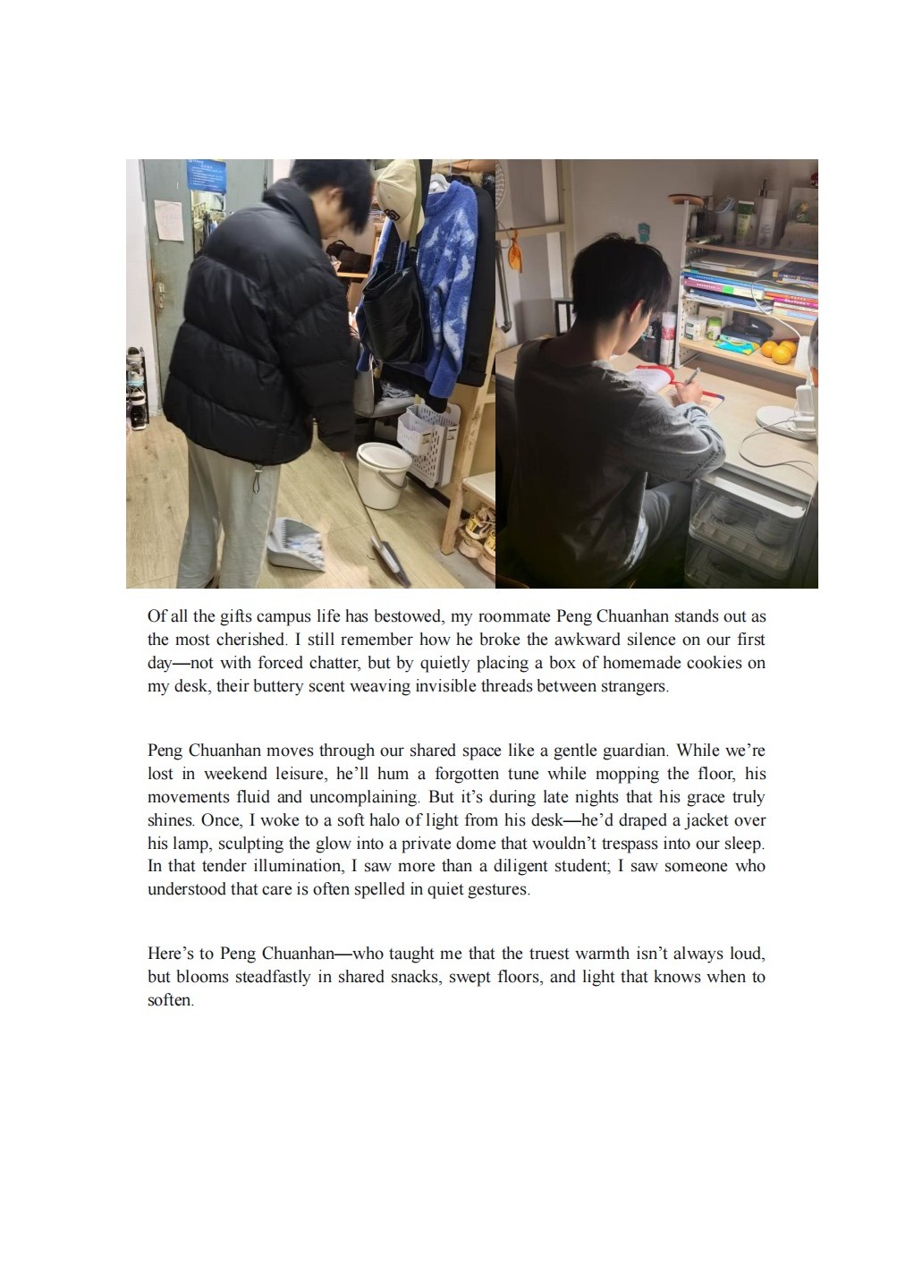 本次活動(dòng)不僅豐富了同學(xué)們的課余生活,更增強(qiáng)了寢室凝聚力,為大學(xué)生活留下了一段溫暖而精彩的回憶。希望在未來,這份用英語講述寢室故事、用創(chuàng)意裝點(diǎn)共同家園的熱情能夠延續(xù),讓每一間寢室都成為文化交流的微縮窗口,讓“E”路同行的陪伴,成為每位英院學(xué)子大學(xué)生活中最溫暖的注腳。