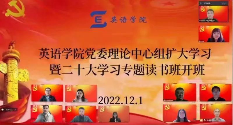 為深入學(xué)習(xí)宣傳貫徹落實(shí)黨的二十大精神,12月1日下午,英語學(xué)院黨委理論中心組以線上形式召開擴(kuò)大會(huì)議,對黨的二十大精神進(jìn)行專題學(xué)習(xí)。全體領(lǐng)導(dǎo)班子成員、黨委委員、組織員、各支部書記和全體行政人員參加。會(huì)議由副處級組織員汪霞主持。