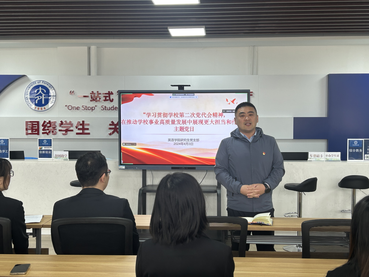為深入貫徹落實(shí)學(xué)校黨委的工作部署,4月3日下午,英語(yǔ)學(xué)院各支部組織黨員開(kāi)展了以“學(xué)習(xí)貫徹學(xué)校第二次黨代會(huì)精神,在推動(dòng)學(xué)校事業(yè)高質(zhì)量發(fā)展中展現(xiàn)更大擔(dān)當(dāng)作為”為主題的黨日學(xué)習(xí)。
