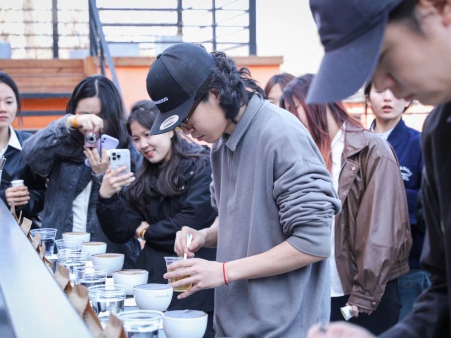 正式進(jìn)入到杯測環(huán)節(jié)時,通過聞干香、注水、撈渣、聞濕香、高中低溫啜吸品嘗等步驟,同學(xué)們親身感受到了不同產(chǎn)地、海拔高度、咖啡處理法等等因素賦予咖啡豆的獨(dú)特風(fēng)味。