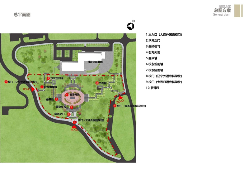 校友廣場(chǎng)規(guī)劃建設(shè)在旅順校區(qū)國(guó)際中文教育樓前,占地面積2.3萬(wàn)平方米,計(jì)劃2024年3月開工建設(shè),2024年6月30日前竣工,建設(shè)時(shí)間90天。校友廣場(chǎng)設(shè)計(jì)三個(gè)不同的園區(qū)入口,分別展示不同時(shí)期的校園入口原貌復(fù)刻歷史校園,讓整個(gè)園區(qū)具有時(shí)代印記,呼應(yīng)校園的新中式風(fēng)格,園區(qū)內(nèi)部中心景觀復(fù)制南山校區(qū)假山水景,以現(xiàn)代的設(shè)計(jì)手法再現(xiàn)歷史經(jīng)典景觀元素,圍繞新中式校園景觀建設(shè)景觀節(jié)點(diǎn)廊架,石刻廣場(chǎng)等景觀元素,同時(shí)增加校友簽到墻、校友捐贈(zèng)墻,滿足來(lái)訪校友的校園打卡捐贈(zèng)需求。