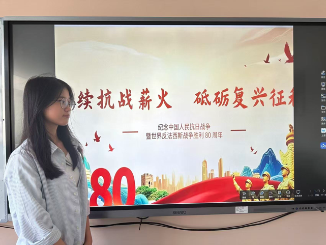 各班級圍繞主題精心策劃,將歷史回顧與時代思考緊密結合。同學們在觀看抗戰(zhàn)歷史紀錄片片段后,進行了小組討論和代表發(fā)言,直觀感受革命先輩在艱苦卓絕的環(huán)境下浴血奮戰(zhàn)的歷程。部分班級還結合專業(yè)特色,通過中英文雙語演講與抗戰(zhàn)歷史文獻譯讀的方式深入探討了抗戰(zhàn)精神在新時代的價值內涵,在語言實踐中傳遞對和平的珍視與對歷史的敬畏,讓每一位參與同學都在沉浸式的學習與交流中,加深了對歷史的認知和對使命的理解。