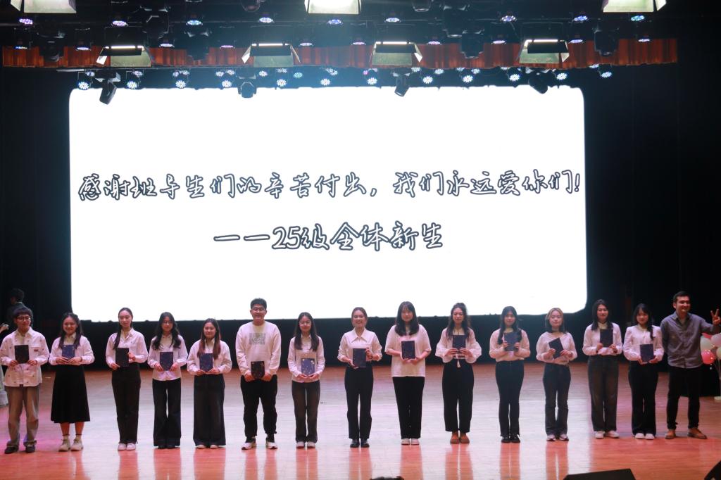 中場休息過后,第二階段“綻放·韶華如歌”正式開始。一場歌曲串燒《飛云之下+至少還有你》將大家的情緒再次點燃,2025級新生教官和各班班導生共同參演情景劇+歌唱《赴一場遇見,憶一段時光》,相聲《如此搭檔》令觀眾捧腹大笑,舞蹈《雨澗春行圖》優(yōu)雅靈動,歌曲《新的心跳》動人心弦,以花為主題的《E-Show》引得在場觀眾陣陣掌聲。隨后,孫碩副書記上臺,親自為同學們抽取并揭曉了獲得本屆嘉年華暨2025級新生迎新晚會特等獎的同學,將展演的氛圍推向又一個高潮!抽獎之后,由2025級輔導員達尼亞爾江·亞力坤江為各班班導生頒獎,表彰其為同學們的辛勤付出與一路上的溫暖陪伴。