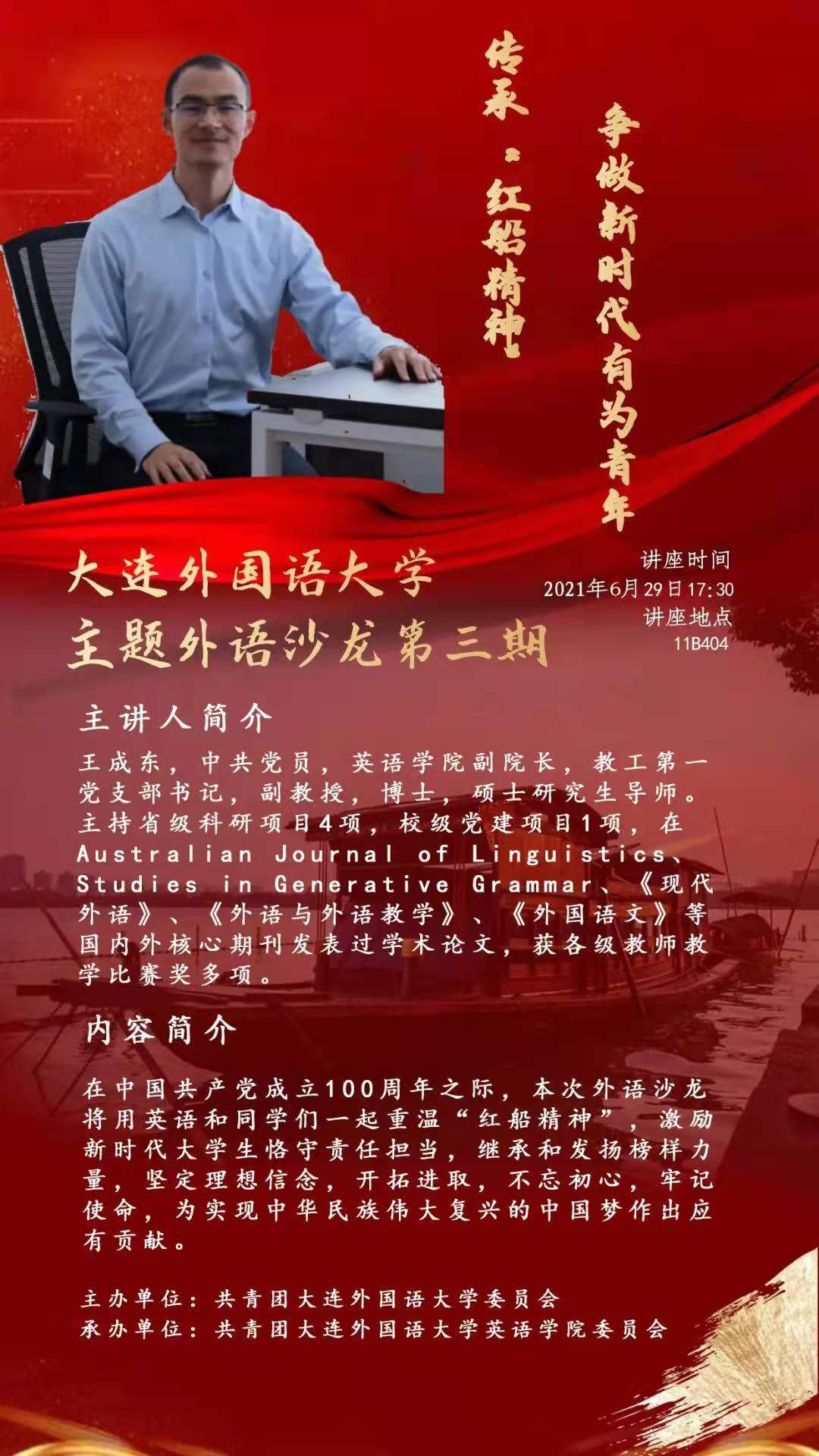 本期沙龍我們將邀請英語學院副院長王成東老師,帶領同學們用英語重溫“紅船精神”,圍繞此進行討論與分享。
