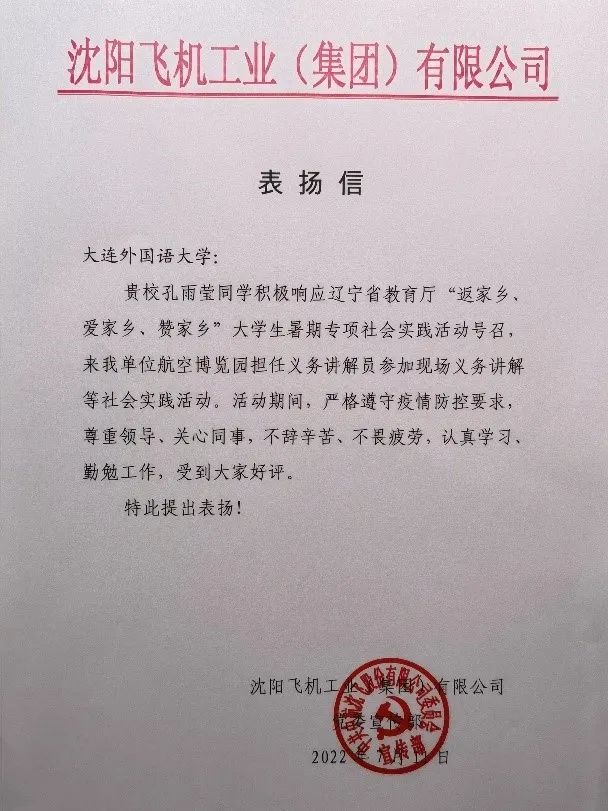 在社會(huì)實(shí)踐活動(dòng)中,我充分領(lǐng)略了我國(guó)航空事業(yè)的發(fā)展歷程和輝煌成就,近距離學(xué)習(xí)感受到以羅陽(yáng)為代表的航空科技工作者的可貴精神和卓越品質(zhì),不斷鞏固了服務(wù)社會(huì)、報(bào)效祖國(guó)的決心,也從中獲得了強(qiáng)勁的奮斗動(dòng)力。