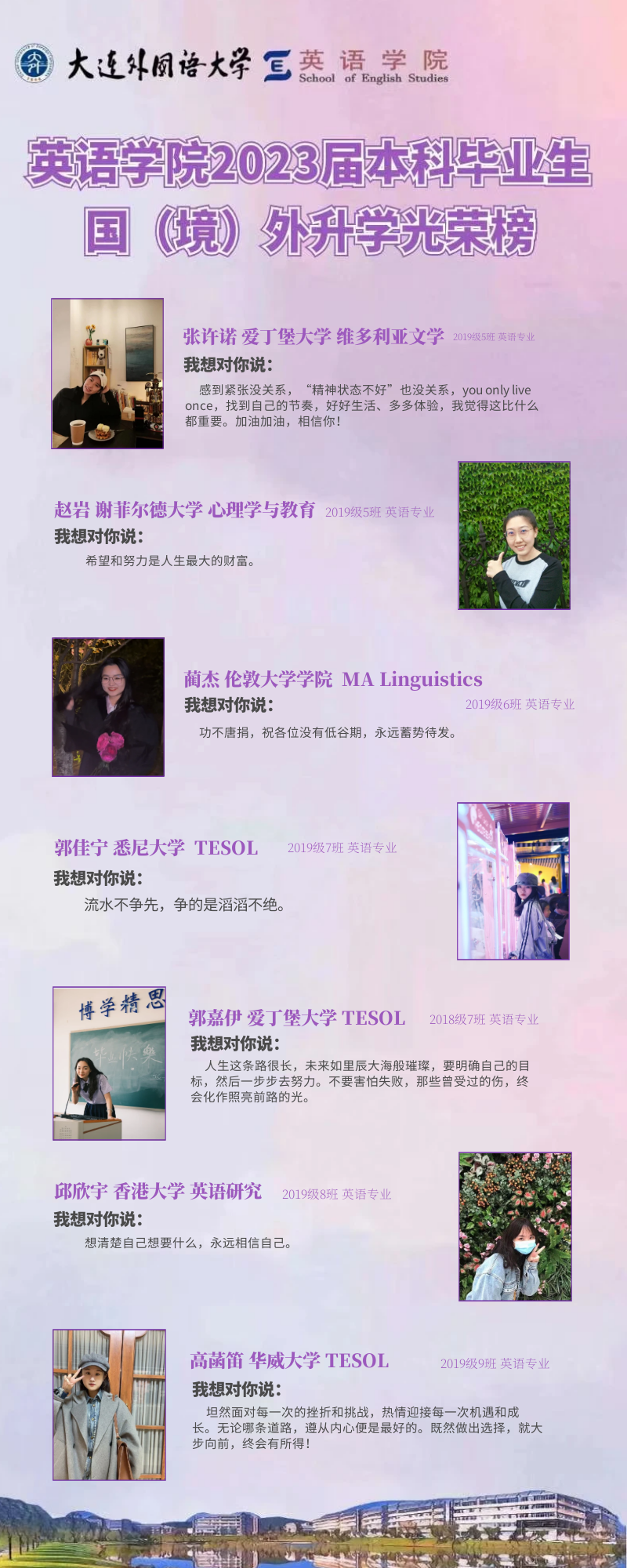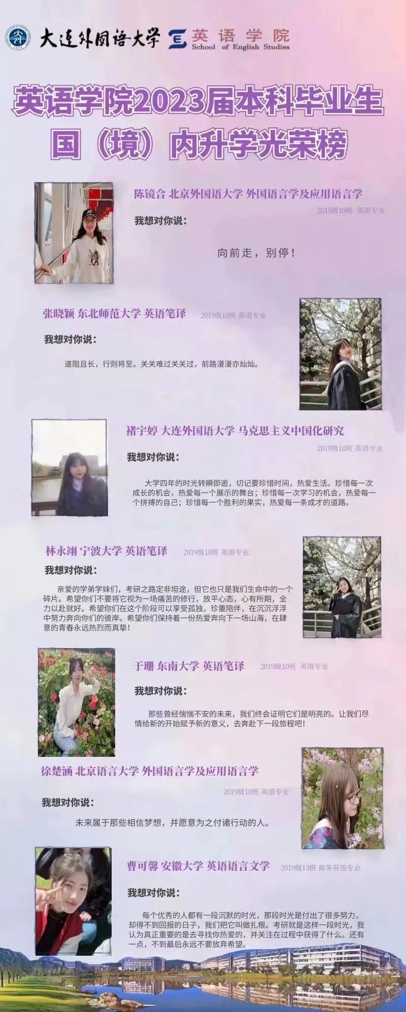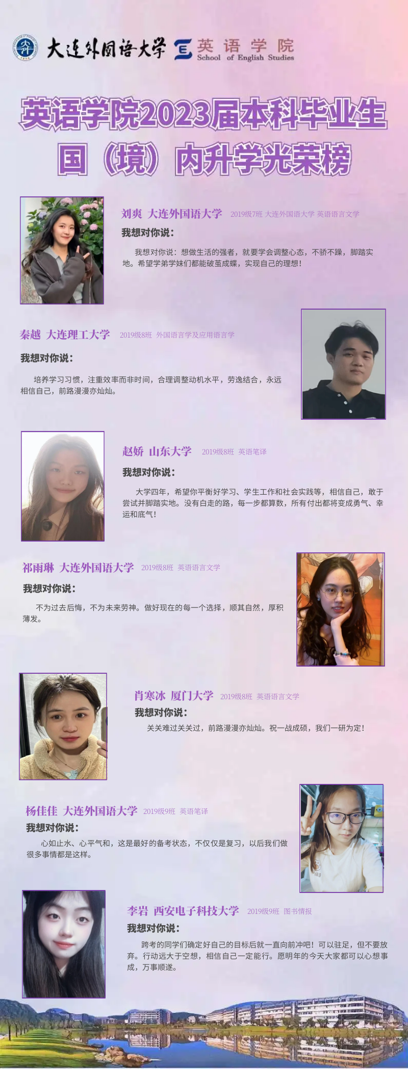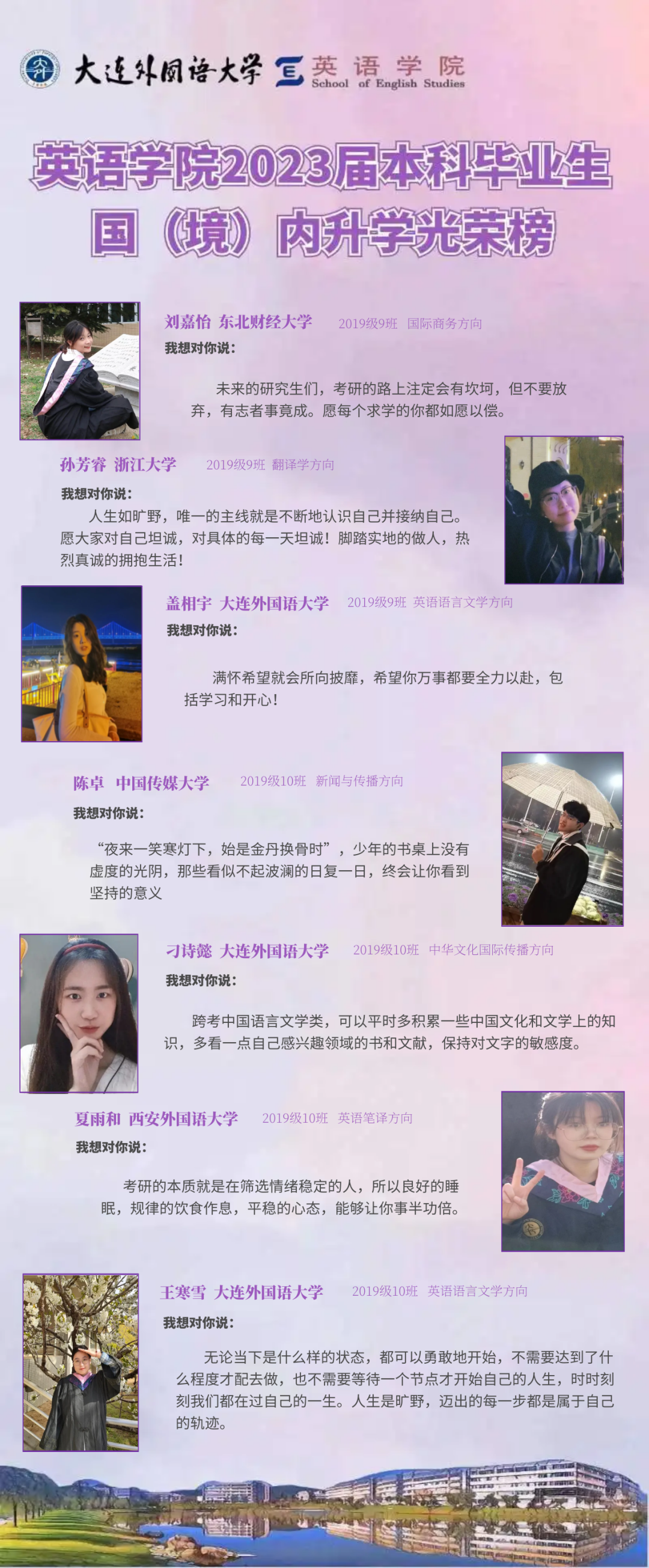 崇德尚文,理想信念肆意飛揚(yáng);兼收并蓄,道德智慧閃閃發(fā)光。衷心祝愿2023屆畢業(yè)生學(xué)子們能在未來(lái)的旅途上堅(jiān)持終身學(xué)習(xí)的優(yōu)良品質(zhì),在順應(yīng)時(shí)代潮流的成才道路上繼續(xù)披荊棘、破風(fēng)浪,順利到達(dá)理想的彼岸。與此同時(shí),英語(yǔ)學(xué)院的全體師生也將奮楫篤行,在為國(guó)家培養(yǎng)富有社會(huì)責(zé)任感、家國(guó)情懷和國(guó)際視野的創(chuàng)新型人才道路上馳而不息,持續(xù)為國(guó)家和社會(huì)輸送高質(zhì)量外語(yǔ)人才!