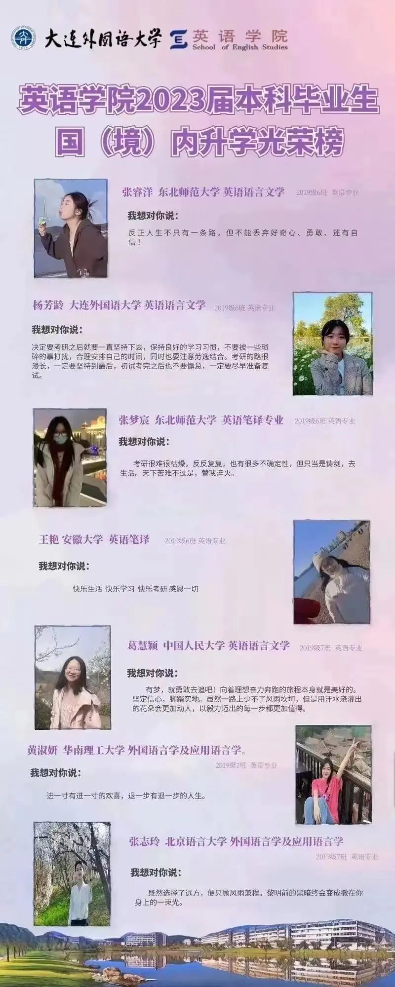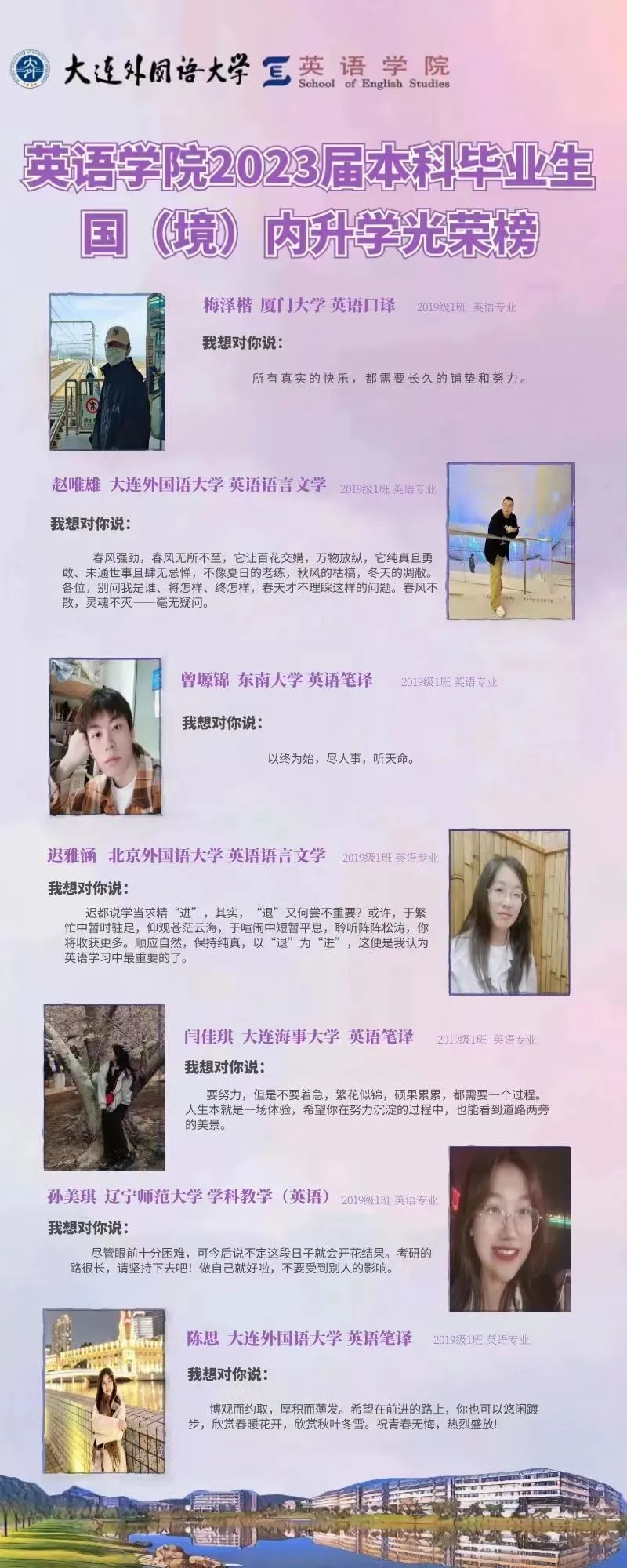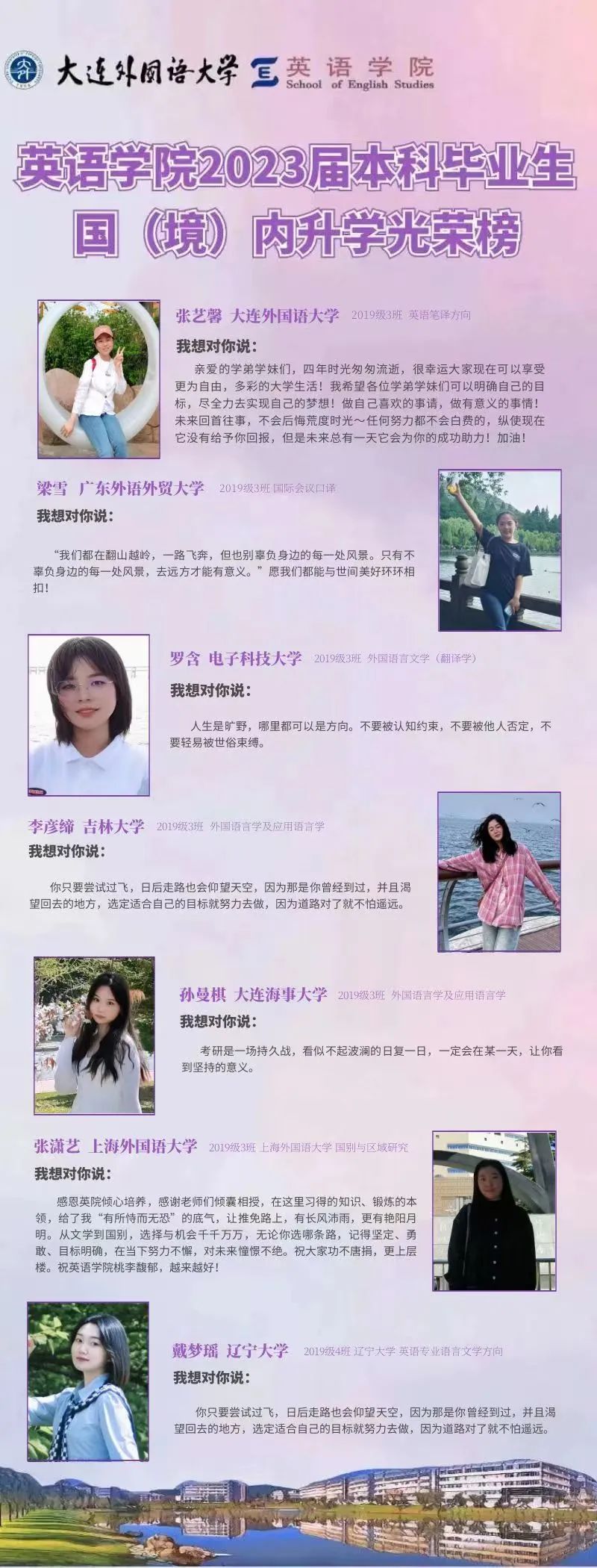 崇德尚文,理想信念肆意飛揚(yáng);兼收并蓄,道德智慧閃閃發(fā)光。衷心祝愿2023屆畢業(yè)生學(xué)子們能在未來(lái)的旅途上堅(jiān)持終身學(xué)習(xí)的優(yōu)良品質(zhì),在順應(yīng)時(shí)代潮流的成才道路上繼續(xù)披荊棘、破風(fēng)浪,順利到達(dá)理想的彼岸。與此同時(shí),英語(yǔ)學(xué)院的全體師生也將奮楫篤行,在為國(guó)家培養(yǎng)富有社會(huì)責(zé)任感、家國(guó)情懷和國(guó)際視野的創(chuàng)新型人才道路上馳而不息,持續(xù)為國(guó)家和社會(huì)輸送高質(zhì)量外語(yǔ)人才!