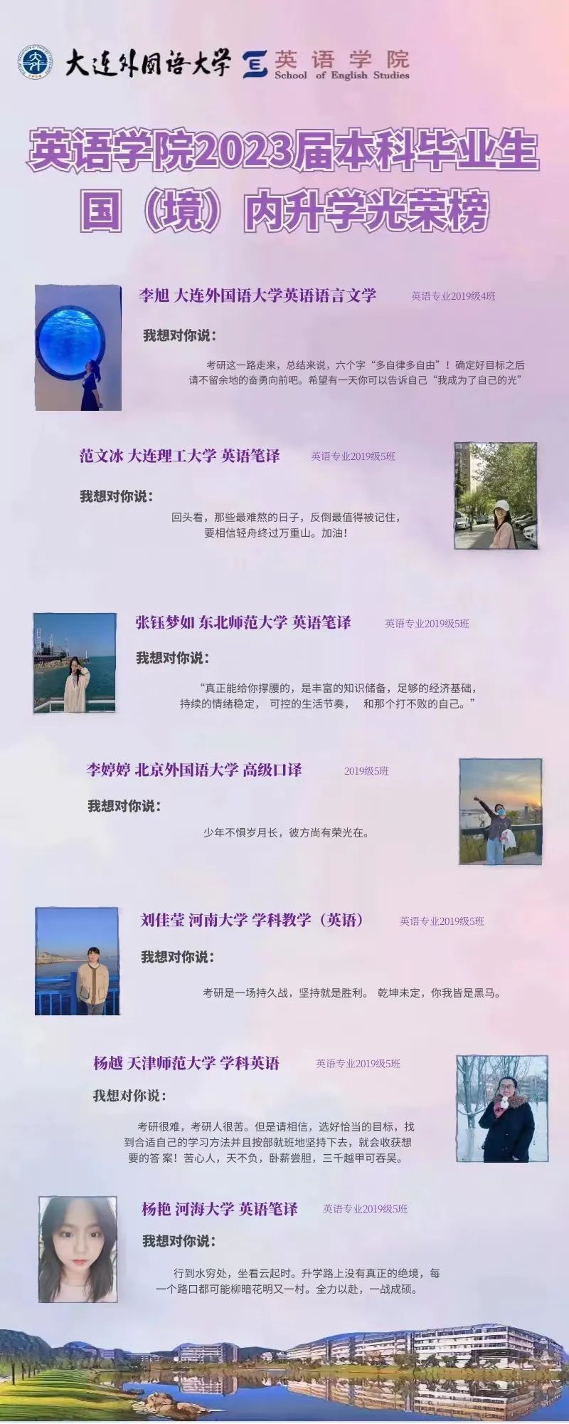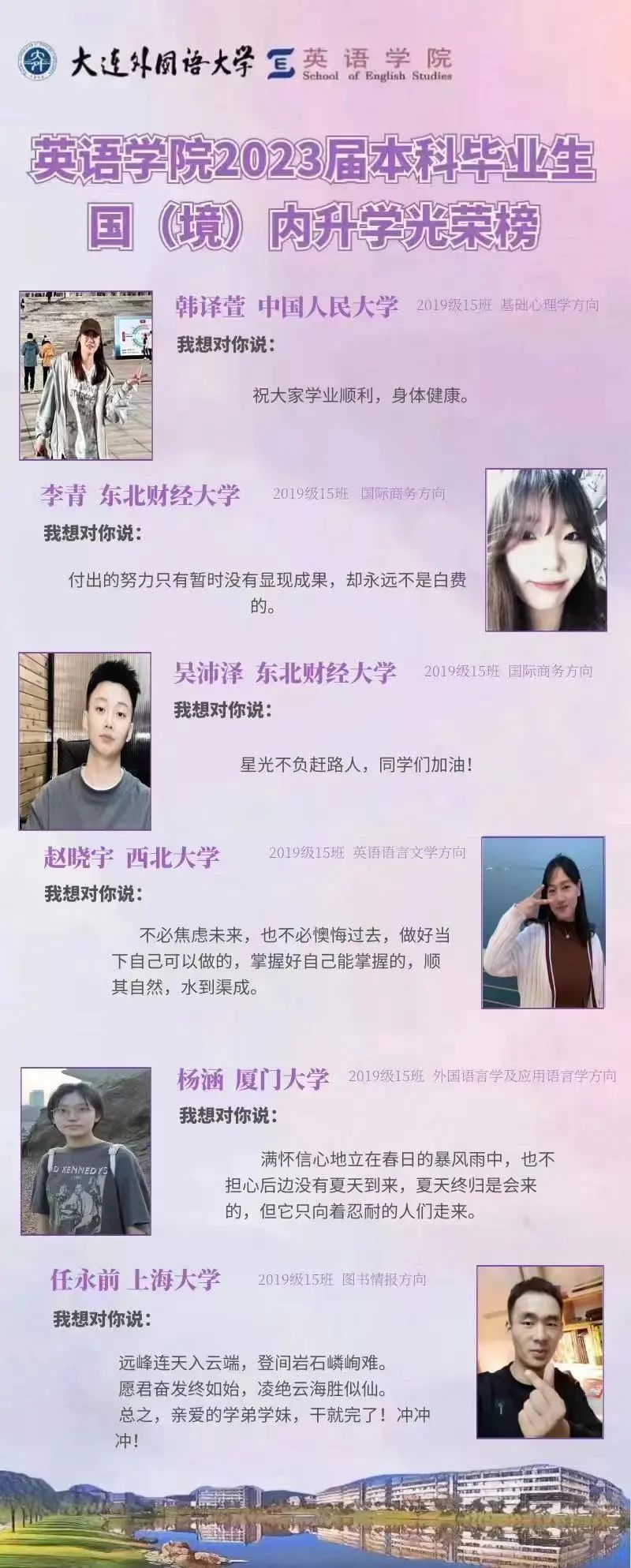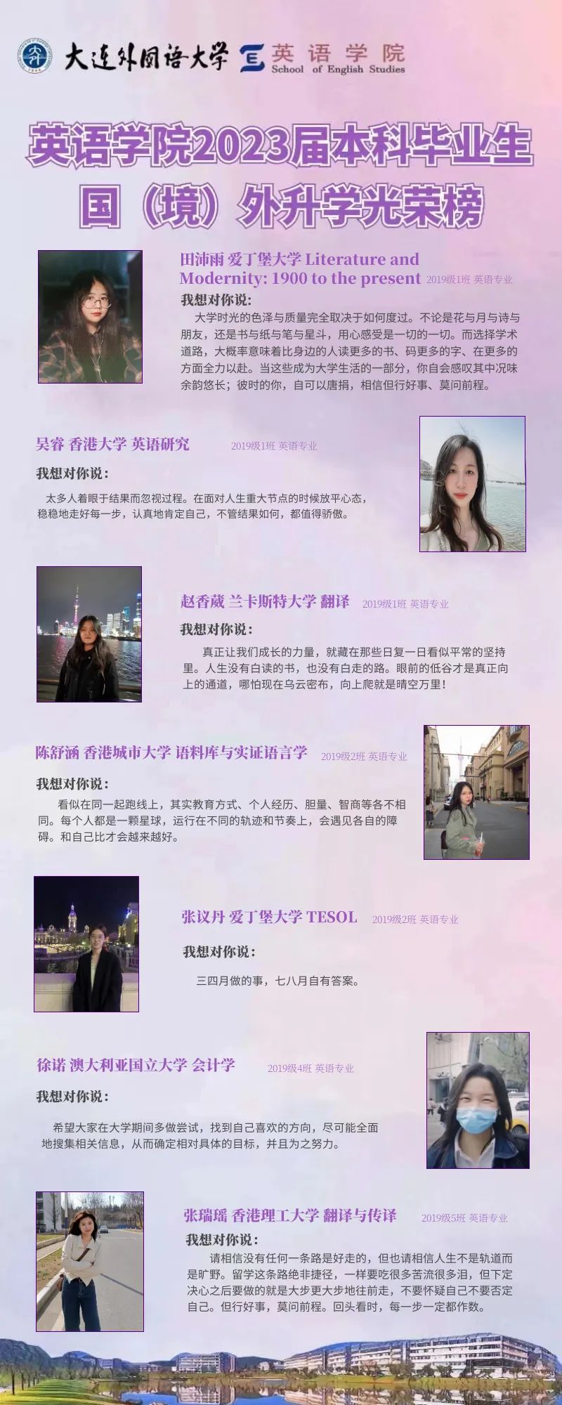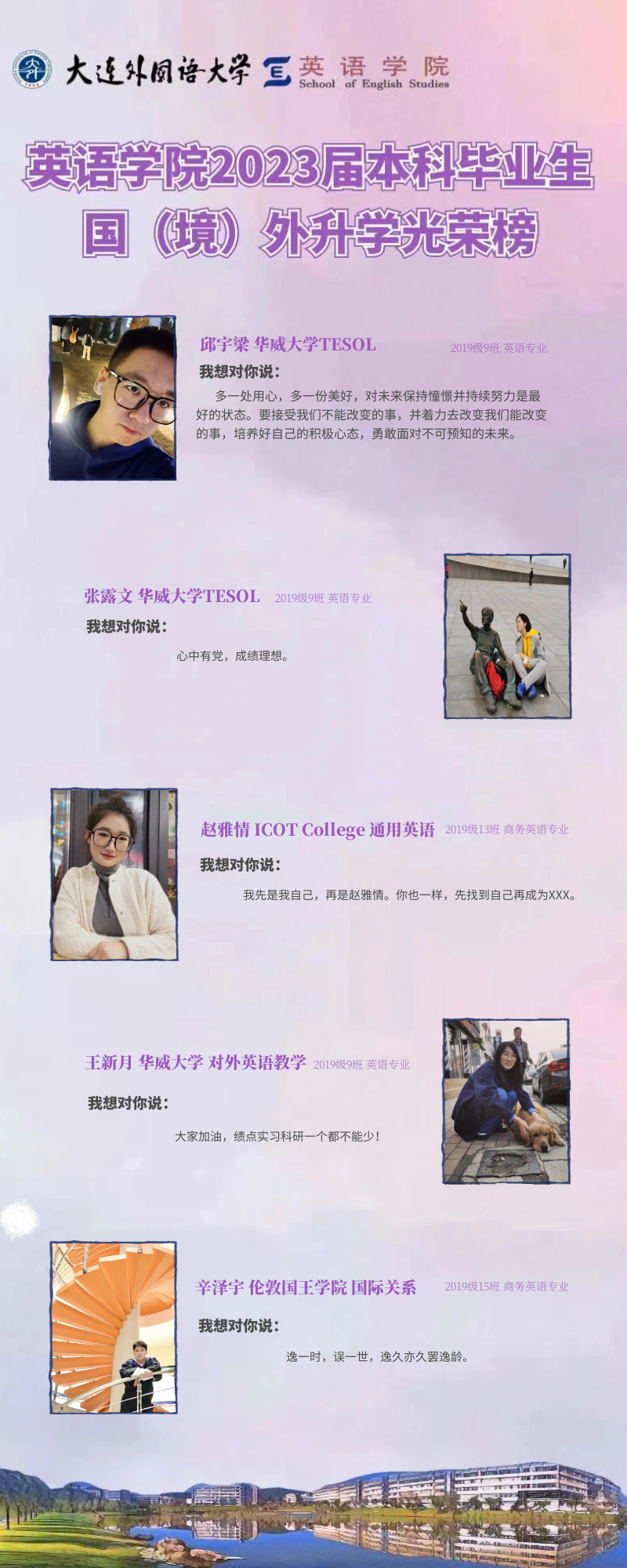崇德尚文,理想信念肆意飛揚(yáng);兼收并蓄,道德智慧閃閃發(fā)光。衷心祝愿2023屆畢業(yè)生學(xué)子們能在未來(lái)的旅途上堅(jiān)持終身學(xué)習(xí)的優(yōu)良品質(zhì),在順應(yīng)時(shí)代潮流的成才道路上繼續(xù)披荊棘、破風(fēng)浪,順利到達(dá)理想的彼岸。與此同時(shí),英語(yǔ)學(xué)院的全體師生也將奮楫篤行,在為國(guó)家培養(yǎng)富有社會(huì)責(zé)任感、家國(guó)情懷和國(guó)際視野的創(chuàng)新型人才道路上馳而不息,持續(xù)為國(guó)家和社會(huì)輸送高質(zhì)量外語(yǔ)人才!