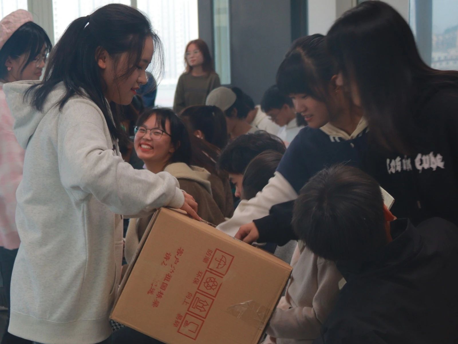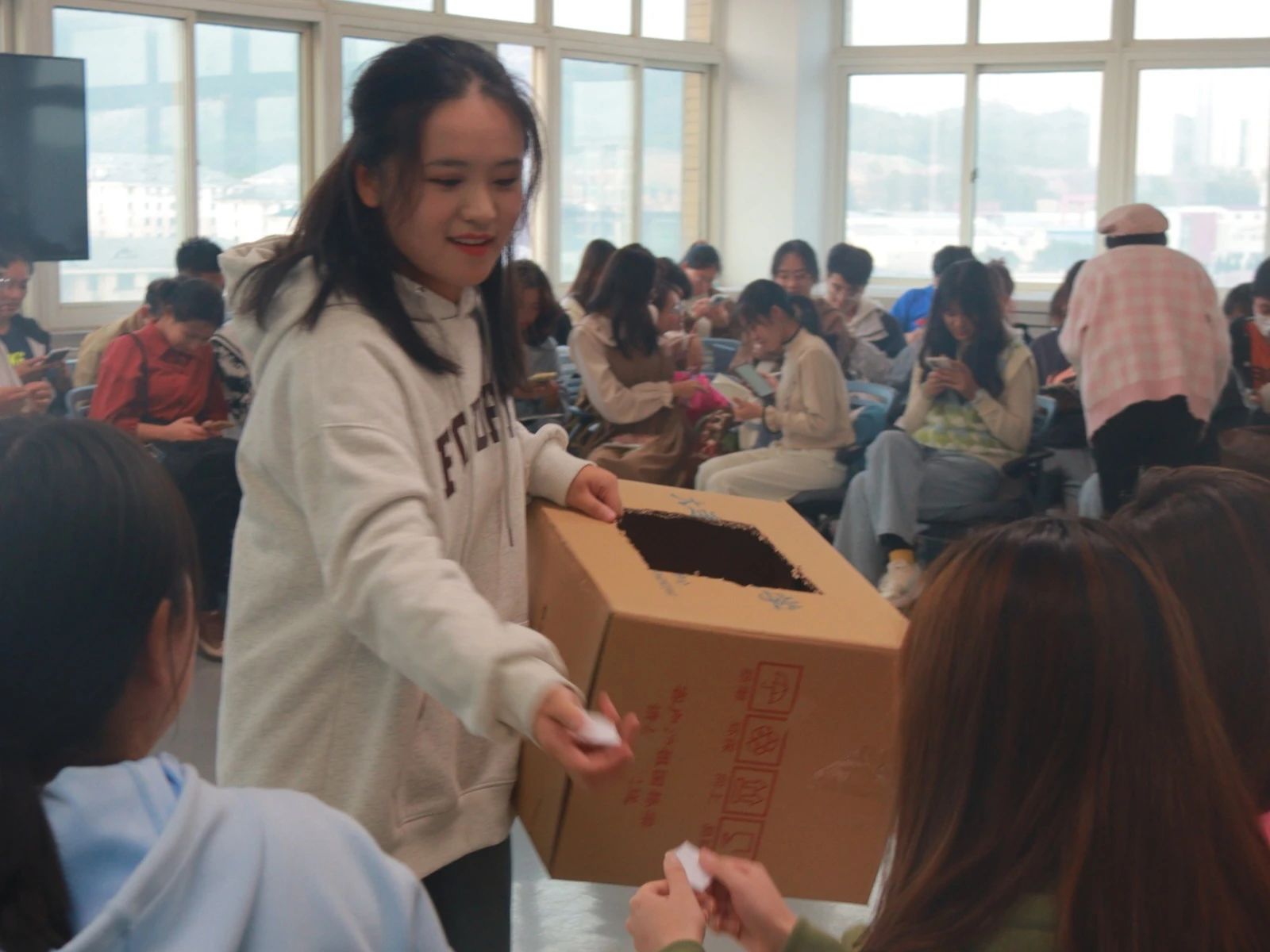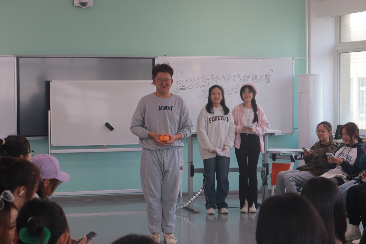 開場(chǎng)前,同學(xué)們將寫給同級(jí)小伙伴的卡片放入紙箱中。活動(dòng)開始后,主持人帶領(lǐng)大家進(jìn)行擊鼓傳花。隨著拍手聲的逐漸急促,小南瓜燈在大家手中起起落落,現(xiàn)場(chǎng)歡呼聲、吶喊聲連成一片。最終被傳到的人上臺(tái)做自我介紹并推薦家鄉(xiāng)景點(diǎn)與美食。三輪過后,現(xiàn)場(chǎng)氣氛活躍,語(yǔ)笑歡喧。