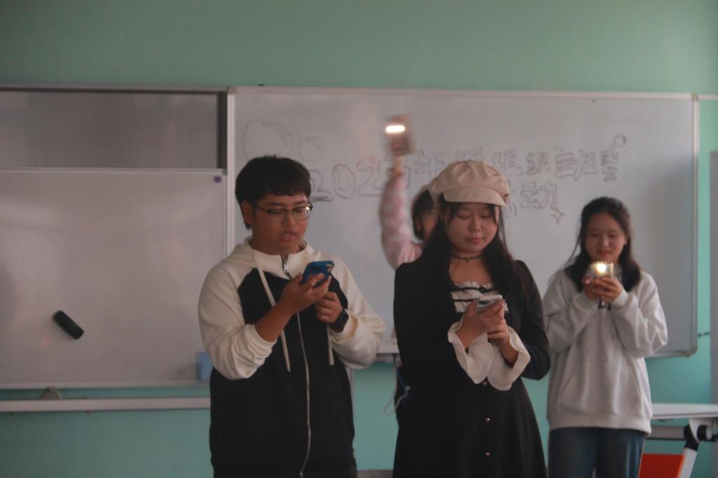 暖場(chǎng)游戲結(jié)束后,主持人安排 12 位年級(jí)組織成員上前進(jìn)行自我介紹,其余人傳遞紙箱抽取卡片,并加上微信,如果兩?抽到互相寫的卡片,可任意指定一人接受懲罰。隨后被指定的人紛紛上臺(tái)大展歌喉,此刻夜幕降臨,同學(xué)們手機(jī)的手電筒化作應(yīng)援棒,帶來點(diǎn)點(diǎn)星光。