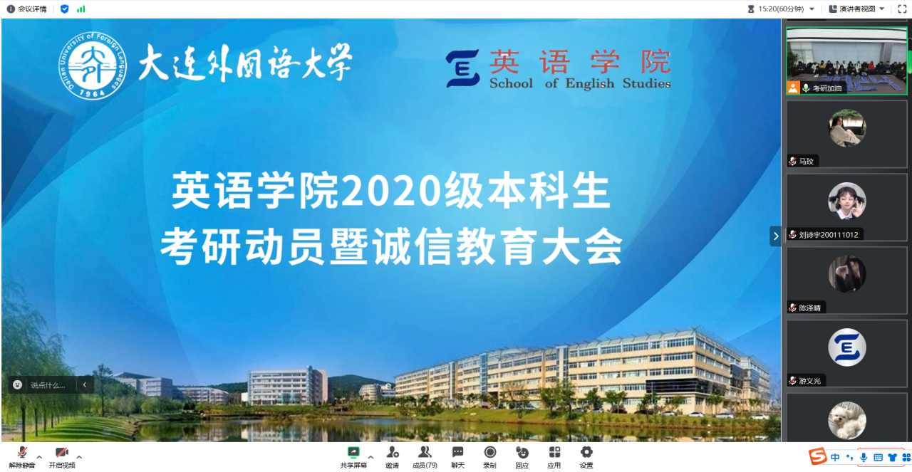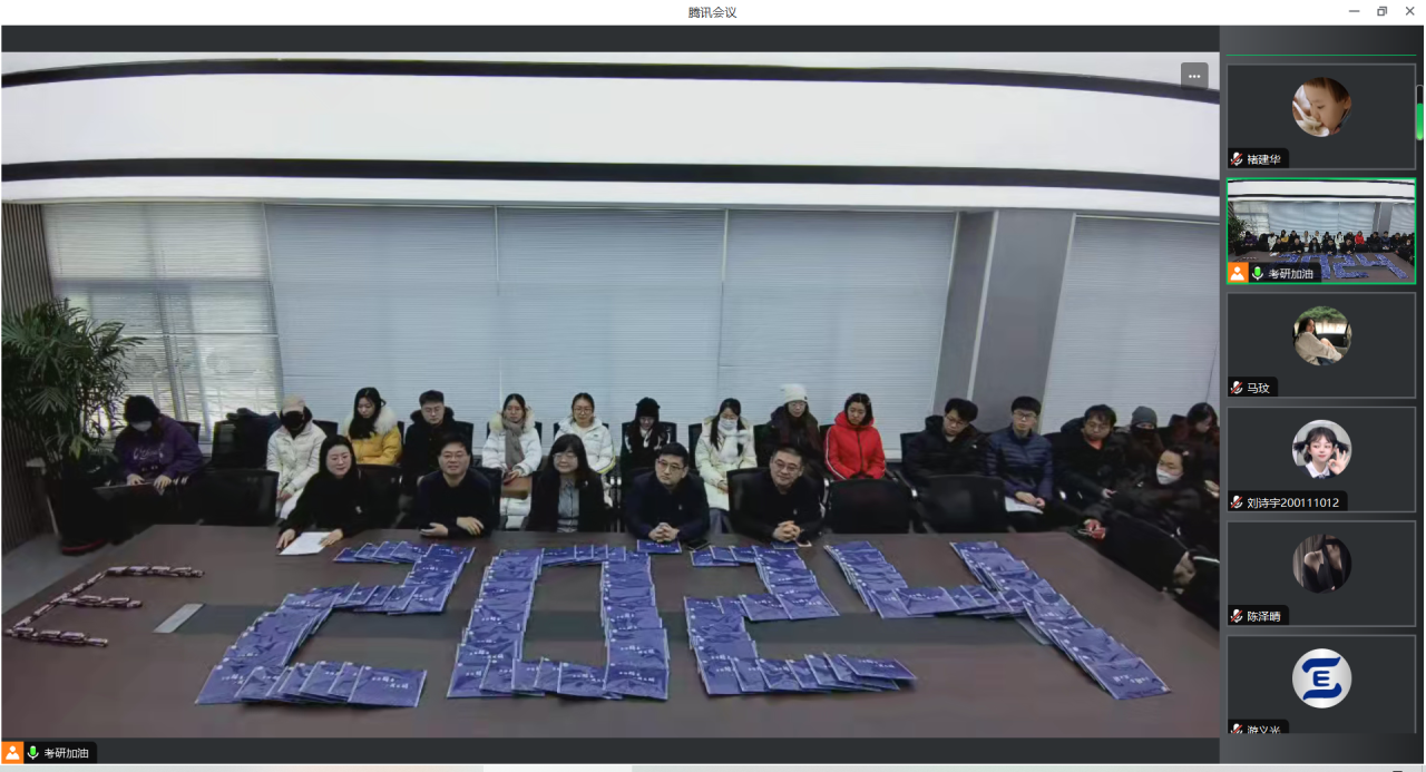 12月18日下午,為鼓勵(lì)即將步入考場的2020級考研學(xué)子,英語學(xué)院以線上線下相結(jié)合的方式為考研學(xué)子舉行了考前動(dòng)員會(huì)暨誠信教育大會(huì)。本次會(huì)議由2020級輔導(dǎo)員老師王藝凝主持,英語學(xué)院院長呂春媚、黨委梁若冰副書記、副院長曲濤、黨委副書記兼紀(jì)委書記孫碩參與此次動(dòng)員會(huì)。