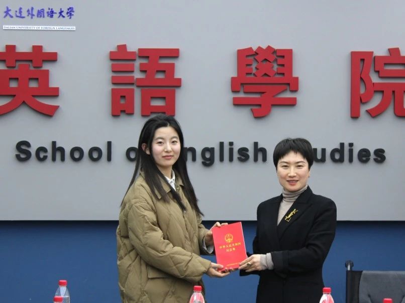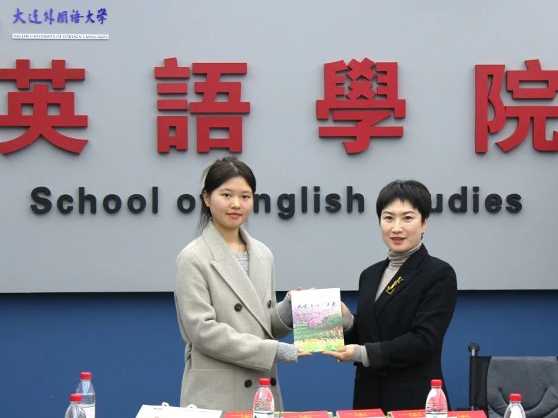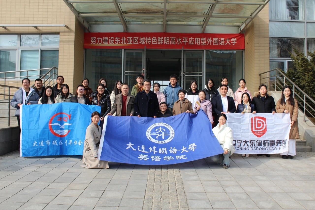 隨后,為感謝英語學(xué)院長期以來為大連市殘疾青年協(xié)會提供的英語專業(yè)服務(wù)與學(xué)習(xí)指導(dǎo),以及多年以來對殘疾青年志愿服務(wù)的大力支持,戰(zhàn)雪峰主席向我院授予“大外助殘 大愛連心”牌匾,孫碩書記作為代表接收牌匾。最后,與會雙方人員攜大連市殘青協(xié)會會旗與大連外國語大學(xué)英語學(xué)院院旗,在勵業(yè)樓門前合影留念。