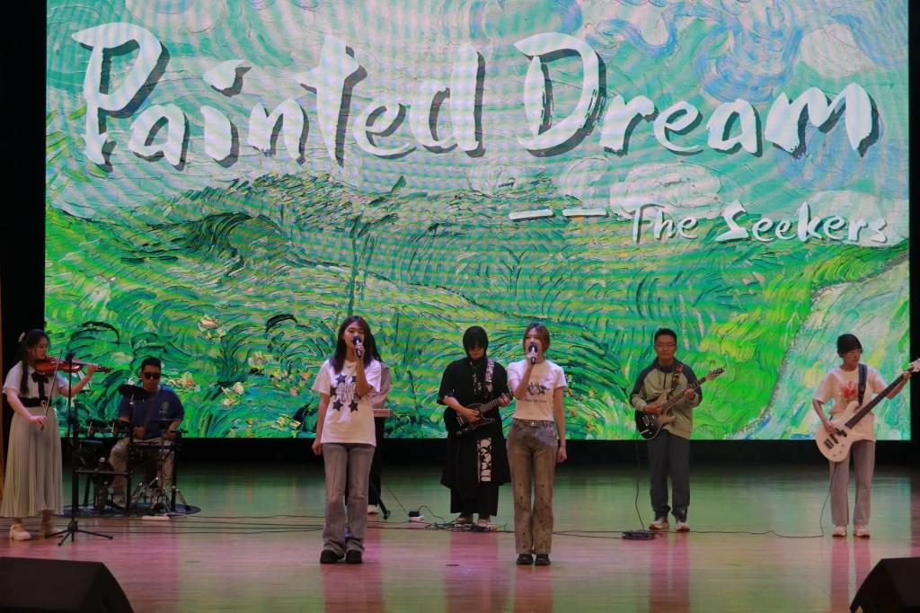 比賽中場(chǎng),英語學(xué)院The Seekers樂隊(duì)以大連外國語大學(xué)即將到來的60周年校慶為主題演出原創(chuàng)曲目《Post Universe》和《Painted Dream》, 他們配合默契,在舞臺(tái)上傾情演繹現(xiàn)代音樂的創(chuàng)新與激情,將每一個(gè)音符、每一段旋律,都化作對(duì)母校風(fēng)雨歲月的深切感念。