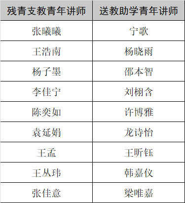 經(jīng)過(guò)對(duì)志愿者教學(xué)能力的評(píng)定,根據(jù)評(píng)委面試評(píng)分結(jié)果,最終選取殘青支教和送教助學(xué)青年講師各9人,共18位講師入選,他們將共同組成一支充滿(mǎn)活力與擔(dān)當(dāng)?shù)臍埣睬嗄曛Ы剃?duì)伍,在志愿服務(wù)中展現(xiàn)青春風(fēng)采,貢獻(xiàn)自身價(jià)值。以下是志愿講師入選名單:
