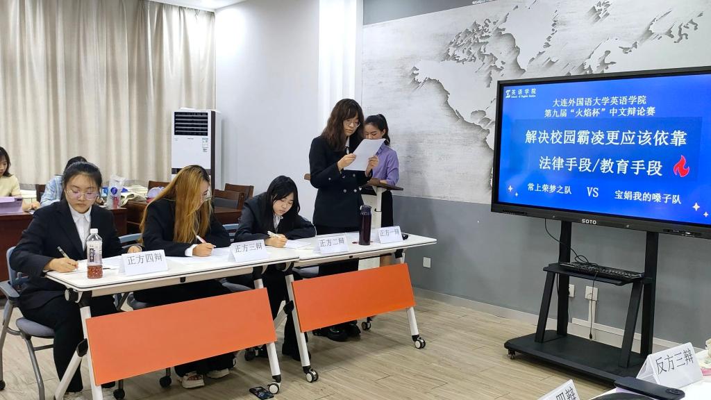 本場比賽的辯題是“解決校園霸凌更應該依靠法律手段還是教育手段”。正方隊伍為2023級9班,反方隊伍為2023級3班。比賽正式開始,雙方辯手你來我往,立論、質(zhì)詢、盤問、小結(jié),引經(jīng)據(jù)典、針鋒相對,充分展現(xiàn)了英院學子出眾的辯才和敏捷的思維。