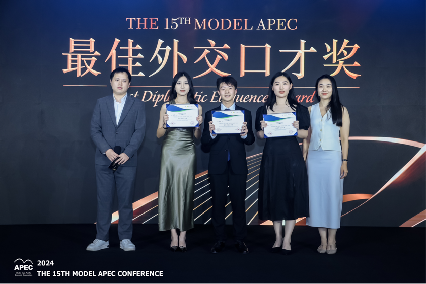 2024年8月16日至18日,第十五屆亞太青年模擬APEC大會(15th MODEL APEC)全國總決賽在北京舉行。本次大會吸引了來自全國四大賽區(qū)的百余所高校參賽,經(jīng)過層層選拔,最終由英語學(xué)院教師李雪梅和劉翔指導(dǎo)的董峻豪、張慧穎、尹赫威、彭力仁和王敖天等五名選手脫穎而出,參加了總決賽。在本次大會的平行會議中,參賽選手們表現(xiàn)出色,取得了令人矚目的成績。經(jīng)過激烈的地區(qū)賽和全國賽的競爭,董峻豪成功晉級全國三強,榮獲全國一等獎;張慧穎獲得最佳外交風(fēng)采獎;尹赫威獲得最佳外交口才獎;彭力仁和王敖天分別獲得全國大會優(yōu)秀獎。