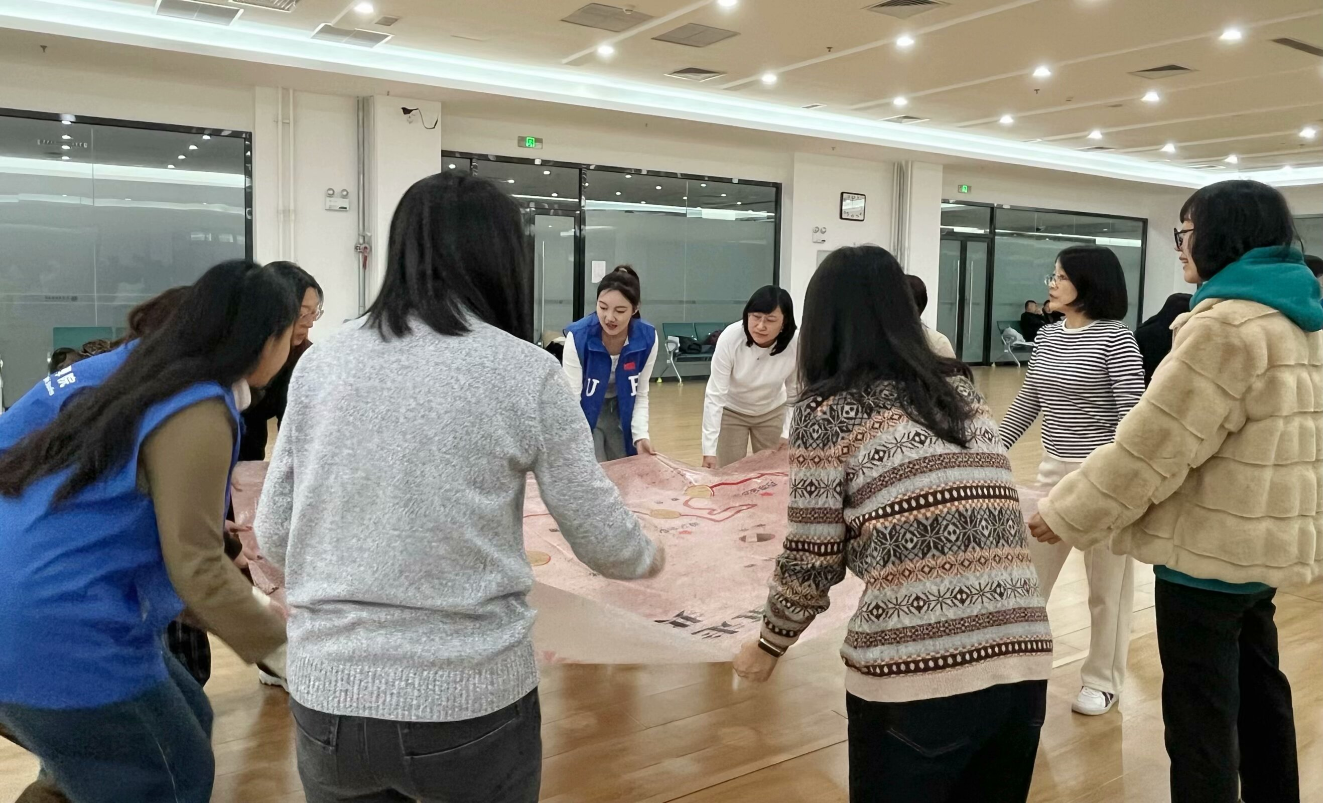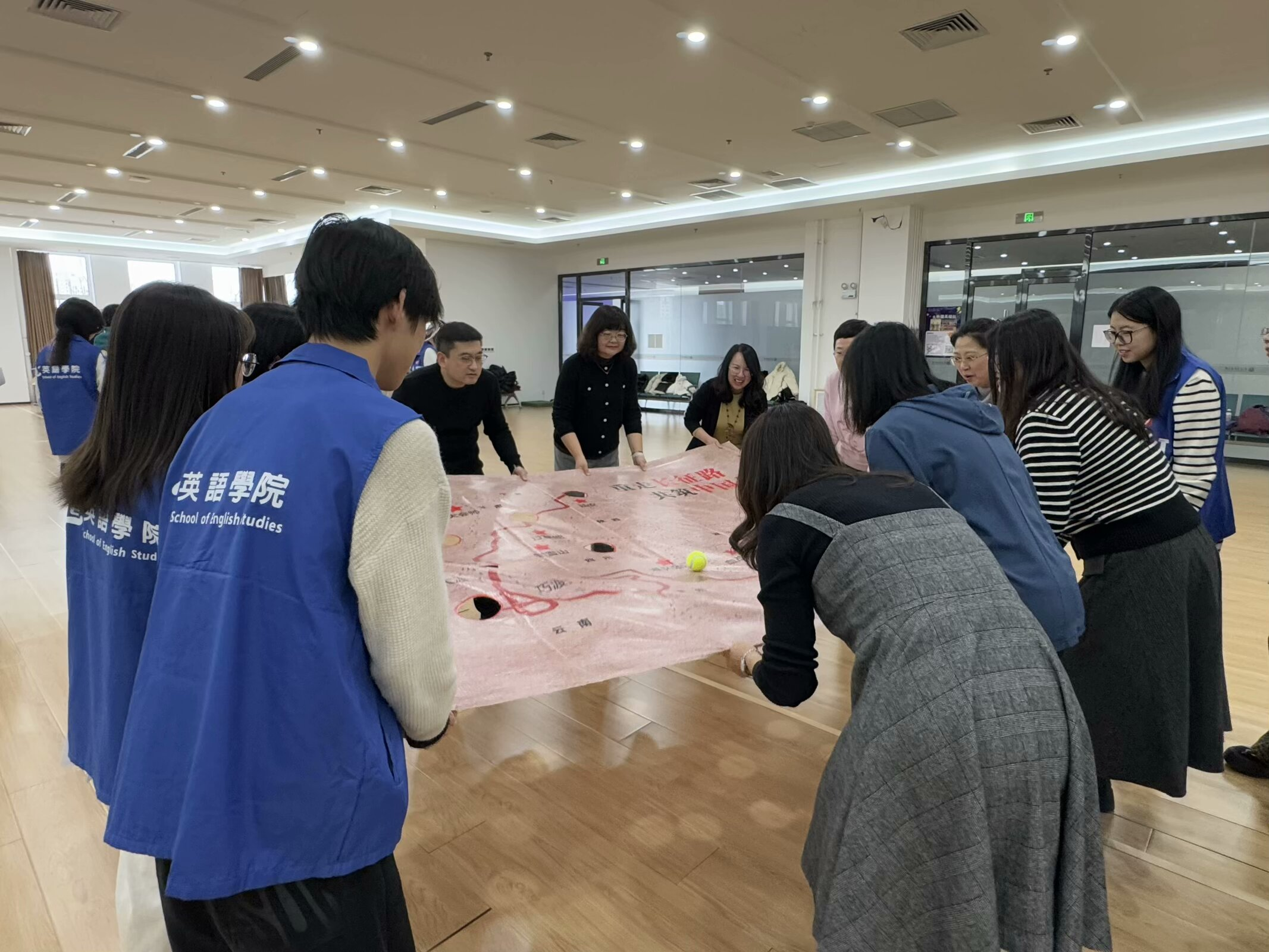 在“支援前線”任務(wù)中,老師們手持接力棒傳遞小球直至終點即完成任務(wù)。此任務(wù)考驗了老師之間的配合與默契,也充分展現(xiàn)了長征背后的支援保障的重要性。