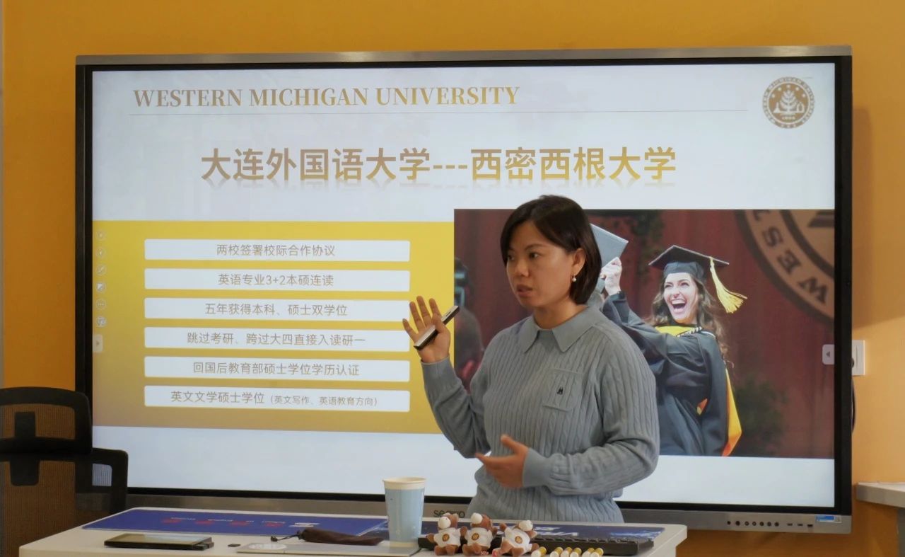 首先,杜老師詳細介紹了美國西密西根大學(xué)的概況,包括地理位置、學(xué)校排名、學(xué)校榮譽、科研狀況、實習(xí)機會以及其所在的密歇根州等相關(guān)信息。接著杜老師介紹了大連外國語大學(xué)與美國西密西根大學(xué)的聯(lián)合培養(yǎng)項目,并對美國西密西根大學(xué)的入學(xué)要求、獎學(xué)金情況、培養(yǎng)項目的申請要求和相關(guān)流程進行了詳細說明。隨后,曾主任與同學(xué)們進行了互動交流,對大家關(guān)心的問題進行了耐心解答,并進一步向同學(xué)們介紹了美國西密西根大學(xué)的師資隊伍、專業(yè)設(shè)置、科研成就、院校合作、實習(xí)實踐等情況,展示了西密西根大學(xué)濃厚的學(xué)習(xí)氛圍、豐富的校園活動、優(yōu)美的周邊環(huán)境、強大的科研實力和寶貴的公司實習(xí)機會。最后,曾校長鼓勵有留學(xué)想法的同學(xué)盡早作好準(zhǔn)備,清晰自己的未來規(guī)劃,把握自我提升的機會,提升就業(yè)競爭力。