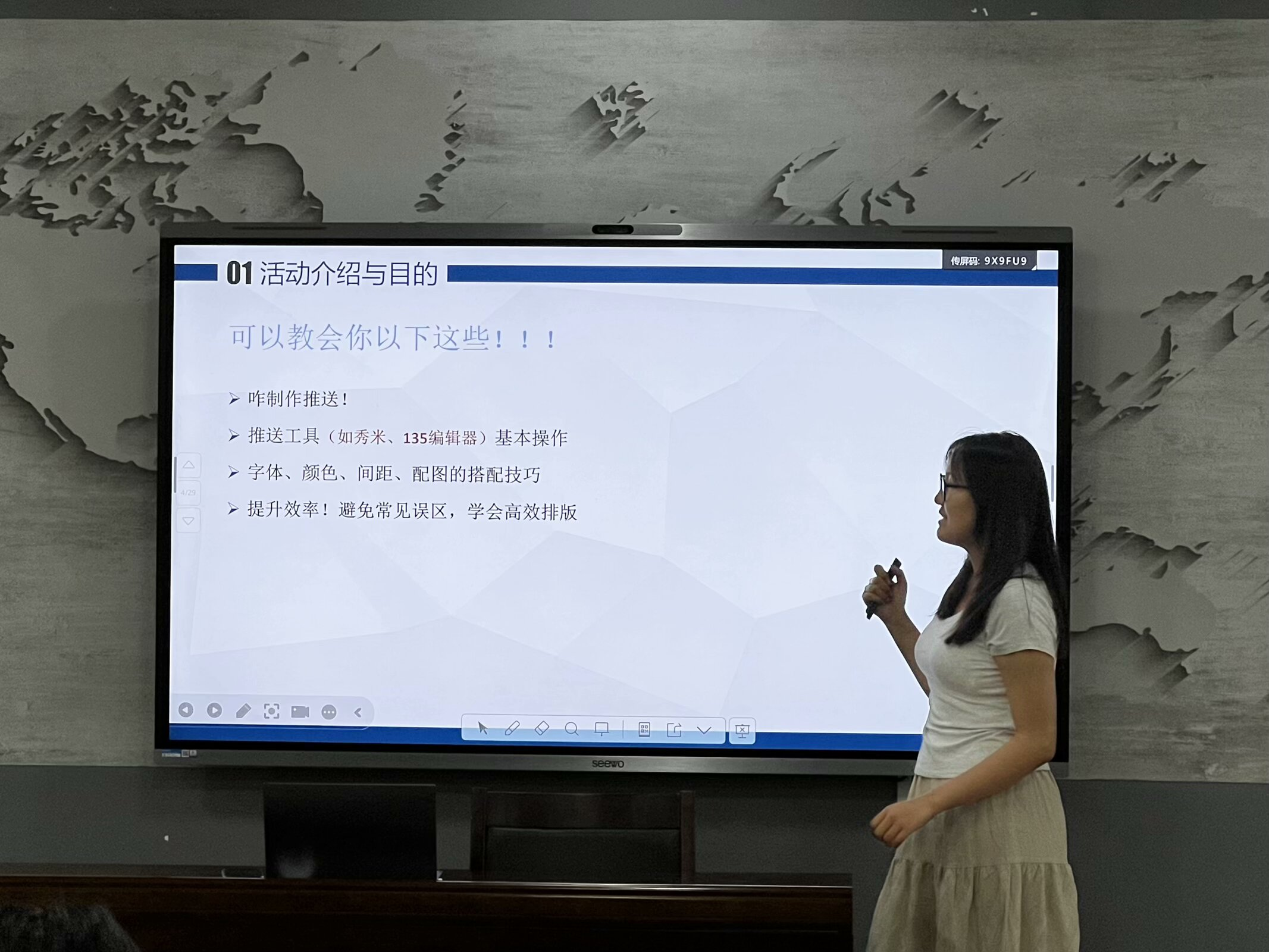 王婧琪同學(xué)為大家?guī)?lái)《公眾號(hào)排版與爆款內(nèi)容的秘密武器》主題課程。她以知名公眾號(hào)案例為切入點(diǎn),生動(dòng)展示了一篇推送所帶來(lái)的影響廣度與傳播深度。在自主學(xué)習(xí)、教練結(jié)合的教學(xué)模式下,王婧琪同學(xué)從推送的定義與特點(diǎn)出發(fā),結(jié)合現(xiàn)場(chǎng)實(shí)際操作演示,在詳細(xì)講解推送制作流程的同時(shí),鼓勵(lì)同學(xué)們即學(xué)即練并提供指導(dǎo)意見(jiàn)。實(shí)操環(huán)節(jié)中,同學(xué)們積極提出疑問(wèn),運(yùn)營(yíng)部成員即時(shí)響應(yīng)、逐一解答,確保每位同學(xué)充分掌握相關(guān)技能,并遴選出優(yōu)秀作品進(jìn)行展示。會(huì)末,王婧琪同學(xué)代表運(yùn)營(yíng)部全體成員對(duì)本次經(jīng)驗(yàn)分享會(huì)進(jìn)行總結(jié),希望同學(xué)們能將所學(xué)應(yīng)用到實(shí)踐,在新技能的學(xué)習(xí)中實(shí)現(xiàn)自我成長(zhǎng)與提升。