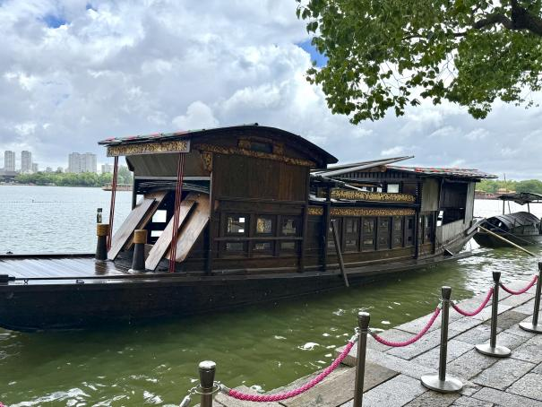 實(shí)踐團(tuán)乘船抵達(dá)南湖湖心島。這座僅1公頃的小島,既是地理上的“革命原點(diǎn)”,更是精神上的“信仰燈塔”。南湖紅船,長(zhǎng)16米、寬3米,紫光漆船身與艙內(nèi)八仙桌、藤椅、銅制燈具等細(xì)節(jié),均依當(dāng)事人回憶復(fù)原——正是在這里,代表們通過(guò)《中國(guó)共產(chǎn)黨第一個(gè)綱領(lǐng)》,以“第三國(guó)際萬(wàn)歲”的呼聲宣告中國(guó)共產(chǎn)黨正式成立。煙雨樓前董必武題寫(xiě)的楹聯(lián)“煙雨樓臺(tái)革命萌生此間曾著星星火,風(fēng)云世界逢春蟄起到處皆聞殷殷雷”,將千年園林與百年黨史巧妙勾連;樓前兩棵450年樹(shù)齡的銀杏樹(shù),既見(jiàn)證過(guò)明清文人雅集,更目睹了一大代表們的歷史時(shí)刻。