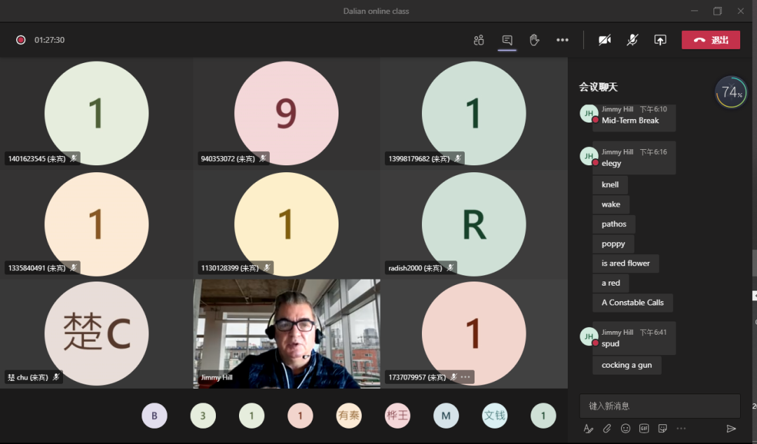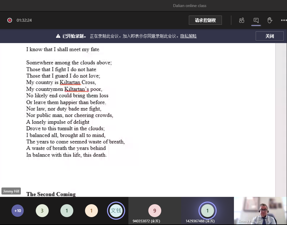 2020年10月19日至10月23日,愛爾蘭國家學(xué)院副校長Jimmy Hill教授為2018級英語專業(yè)本科生講授《愛爾蘭詩歌》課程。本次課程共計(jì)17課時(shí),采用愛爾蘭國家學(xué)院線上系統(tǒng)授課。整個(gè)課程內(nèi)涵豐富、形式多樣,大大加深了學(xué)生們對詩歌的理解及對愛爾蘭的認(rèn)識,拓展了學(xué)生們的國際視野及人文思維。