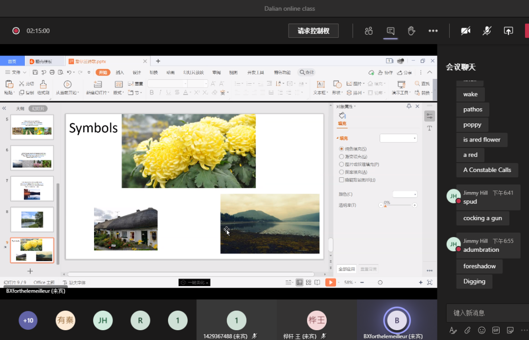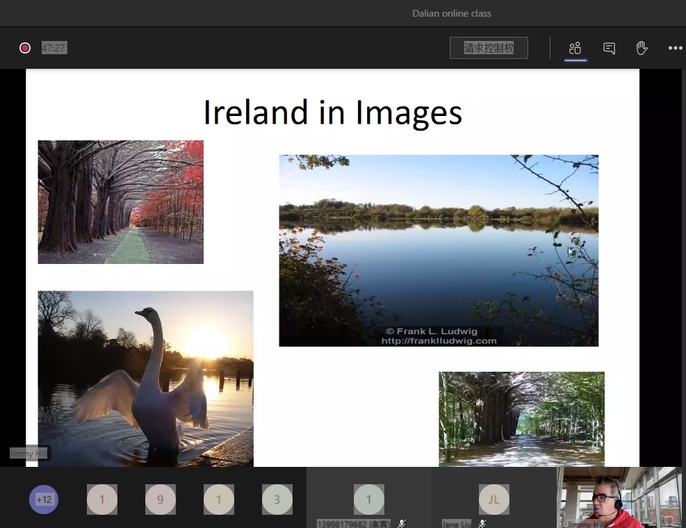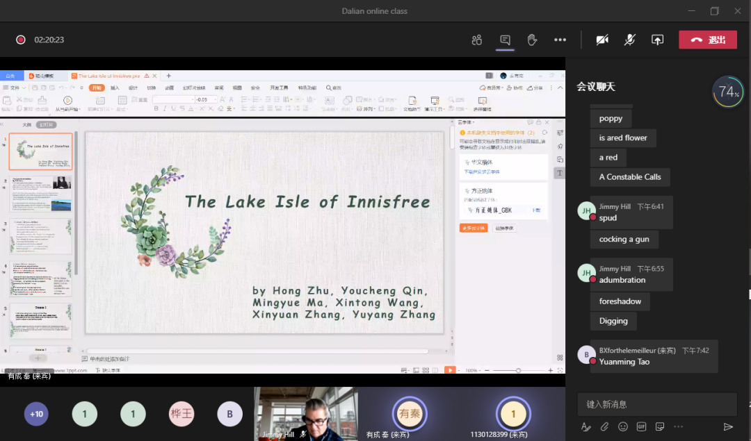 Jimmy教授通過主題、意象以及象征手法探討愛爾蘭現(xiàn)代詩歌,主要圍繞葉芝(William Butler Yeats)、卡瓦納(Patrick Kavanagh)和希尼(Seamus Heaney)三位著名詩人的作品展開講解,不但讓學(xué)生了解什么是詩歌,何為現(xiàn)代詩歌,如何闡釋詩歌,而且鼓勵(lì)學(xué)生多維思考,積極互動,享受詩歌本身。課堂上,Jimmy教授時(shí)常帶領(lǐng)學(xué)生一起朗讀詩歌、欣賞由詩歌改編的歌曲和學(xué)習(xí)詩歌選集,結(jié)合豐富多元的代表性圖片引導(dǎo)學(xué)生深度了解愛爾蘭社會、政治、歷史和文化,讓學(xué)生深切體悟愛爾蘭詩歌富含的思想與精神。Jimmy教授對詩歌的熱愛及其淵博的學(xué)識使學(xué)生頗受感染,他們積極投入課堂活動,緊跟教授思路,大膽發(fā)表見解。在最后一堂課上,學(xué)生們以小組的形式展示了對詩歌The lake Isle of Innisfree的深度理解,其獨(dú)特的見解和流利的口語讓屏幕另一端的Jimmy教授頗為贊賞,給與高度肯定。