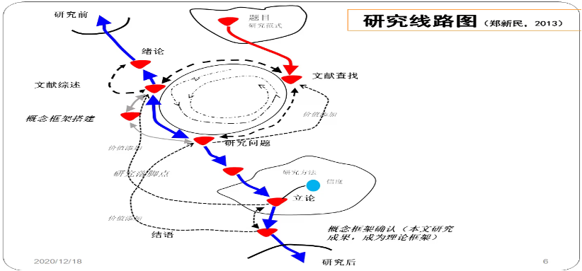 本次講座圍繞選題步驟、選題原則、選題過程以及如何撰寫選題任務(wù)書等方面進(jìn)行了探討。鄭教授首先闡述了研究的概念,認(rèn)為研究應(yīng)由研究問題、數(shù)據(jù)和詮釋三部分組成。隨后,鄭教授結(jié)合研究線路圖對(duì)研究的步驟進(jìn)行了詳細(xì)地講解,具體包括文獻(xiàn)回顧、研究設(shè)計(jì)、資料收集、數(shù)據(jù)分析、探討闡釋等方面。鄭教授尤其強(qiáng)調(diào)文獻(xiàn)綜述的重要性,認(rèn)為基于數(shù)據(jù)庫資源的文獻(xiàn)查找、理論發(fā)展軌跡的梳理以及對(duì)比相關(guān)研究的過程有助于重新認(rèn)識(shí)研究問題,從而實(shí)現(xiàn)價(jià)值添加的目的。最后,鄭教授建議不要盲目照搬理論框架,而應(yīng)該根據(jù)研究問題的屬性和潛在因素進(jìn)行預(yù)判,做出適當(dāng)?shù)恼{(diào)整和補(bǔ)充,嘗試性地搭建自己的概念框架。
