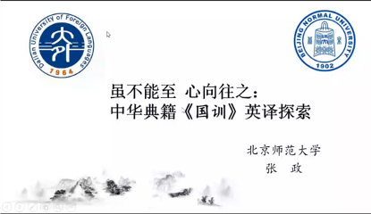 張政教授從翻譯實踐出發(fā),探討了中華典籍《國訓(xùn)》英譯過程中遴選原則、體例編排、翻譯策略及翻譯難點等問題。張教授認(rèn)為,典籍外譯應(yīng)盡量保持中國文化獨有的特質(zhì),形神兼?zhèn)洌〔目缮鲜枷惹亍⑾掠櫱迥瑑?nèi)容可涉及諸子百家、經(jīng)史子集,語言盡量美輪美奐、睿智深刻。隨后,張教授說明了典籍外譯的體例編排,建議提供原文、拼音、語內(nèi)翻譯、出處、英譯和便于查找的索引。張教授還提出在典籍英譯中可適當(dāng)借鑒他人文獻著作,從而達到畫龍點睛的作用。最后,張教授以《國訓(xùn)》英譯過程中的難點為例,分析了現(xiàn)有譯文的不足,并提供了優(yōu)化的英譯版本;同時,他還強調(diào)中外譯者可以互相合作,從而實現(xiàn)典籍外譯的優(yōu)勢互補。