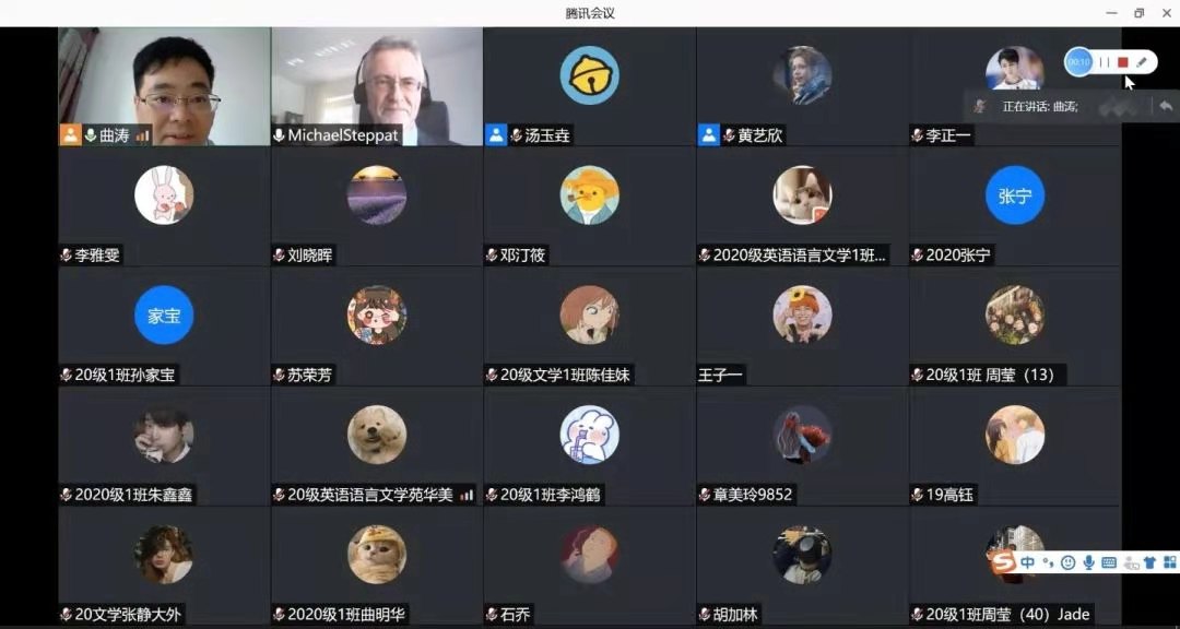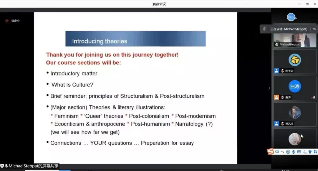 5月10日至5月14日,拜羅伊特大學(xué)教授Michael Steppat應(yīng)英語(yǔ)學(xué)院邀請(qǐng)為研究生開設(shè)“文化文學(xué)理論導(dǎo)論”線上短期課程。此次課程旨在為英美文學(xué)方向的研究生夯實(shí)理論基礎(chǔ)、開闊理論視野,為今后的學(xué)術(shù)研究提供指導(dǎo)與啟示。