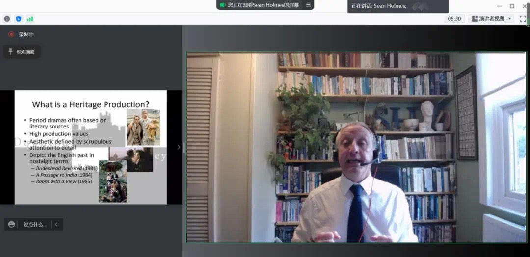 Sean Holmes博士首先分析了英國電視劇《唐頓莊園》的場景、人物和社會背景,并從貴族克勞利一家及其仆人的生活、社會傳統(tǒng)及人物沖突等方面對二十世紀初英國的社會關系及性別差異進行了詳細探討。Sean Holmes博士認為《唐頓莊園》是一部承襲英國通俗文化傳統(tǒng)的影視劇,體現(xiàn)了英國的傳統(tǒng)思想,隱喻了2008年英國遭受金融危機影響的時代背景,傳遞了團結協(xié)作、共克時艱的精神。講座最后,Sean Holmes博士與學生們進行了互動交流,對典型人物進行了深層次剖析,并對當前疫情防控形勢下國際交流問題進行了解答。