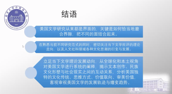 楊教授指出,在多元文化思潮的影響下,原先壁壘分明的界限已被打破,嚴(yán)肅文學(xué)與通俗文學(xué)的界限也越來越模糊,比較邊緣的文學(xué)作品正逐步經(jīng)典化,具有藝術(shù)生命力的作品以及思想深刻、觀點獨特的文學(xué)理論流派也逐漸確立了自己的文學(xué)傳統(tǒng)。新歷史主義、后殖民主義、種族批評和文化研究多模態(tài)等研究視角推動了文學(xué)研究的深化,生態(tài)批評、跨國界研究的出現(xiàn)又提供了不同的研究視角和方法,豐富了美國文學(xué)研究的范式。楊教授認(rèn)為,美國文學(xué)研究從來都是界面的,關(guān)鍵是如何恰當(dāng)?shù)啬ズ辖缦叮巡煌拿娼Y(jié)合起來。在熟悉當(dāng)前不同研究范式的同時,要密切關(guān)注當(dāng)下文學(xué)批評的理論走向,以及人文社科領(lǐng)域各種文化思潮的衍變與發(fā)展。最后,楊教授呼吁中國學(xué)者在學(xué)術(shù)研究中要有中國立場,建設(shè)中國特色學(xué)術(shù)話語體系。